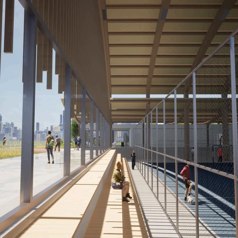 Criar uma quadra esportiva que tenha uma sensação de clareza e leveza ao redor, destacando-se das outras construções predominantes na área. Alguns elementos estéticos podem fazer referência à conexão afetiva ao ambiente natural. O foco principal é proporcionar continuidade e movimento, como uma onda, integrando issoàestruturadaquadra.