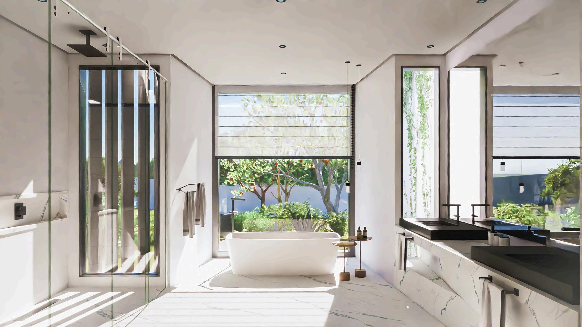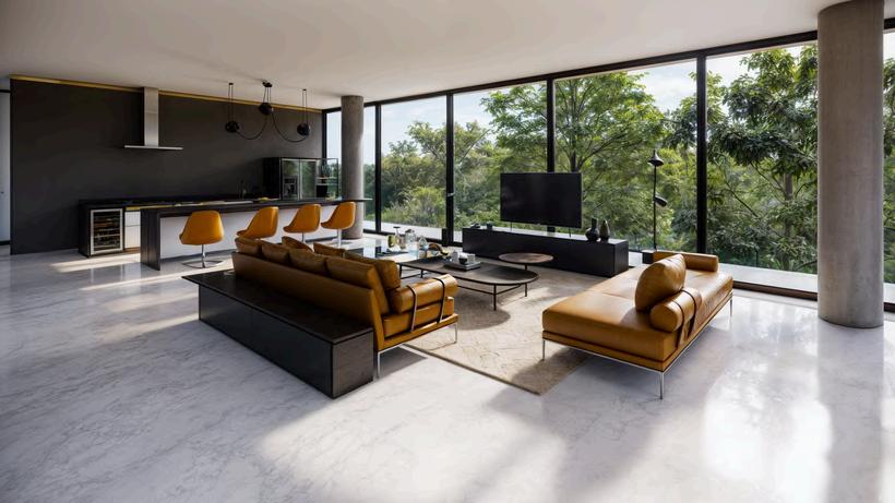 Estacasamodernapossui linhasretas,grandespainéis devidroeumaplantaaberta, maximizandoaluznaturale aintegraçãocomoambiente externo.Ousodemateriais comoconcretoevidro reforçaaestética minimalista.Aestruturase adaptaaoterrenoinclinado, aproveitandoatopografia paracriarumrefúgio funcionaleelegante