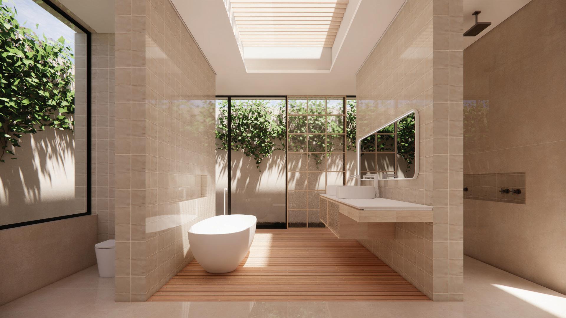 The bathHaus project is an innovative concept for a 25m² bathroom designed for a young couple, seamlessly blending Brazilian and Japanese cultural elements. This design prioritizes a harmonious, flexible space that balances privacy with openness. The layout is meticulously crafted to enhance both comfort and functionality. Earth tones are employed to foster a connection with the lush exterior garden, while maximizing natural light and airflow, creating a serene oasis that reflects the couple’s heritage.