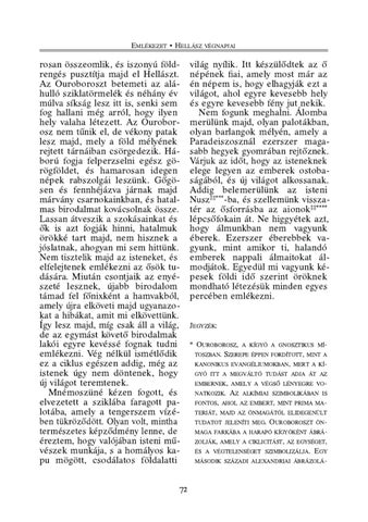 világ nyílik. Itt készülődtek az ő népének fiai, amely most már az én népem is, hogy elhagyják ezt a világot, ahol egyre kevesebb hely és egyre kevesebb fény jut nekik. Nem fogunk meghalni. Álomba merülünk majd, olyan palotákban, olyan barlangok mélyén, amely a Paradeiszosznál ezerszer magasabb hegyek gyomrában rejtőznek. Várjuk az időt, hogy az isteneknek elege legyen az emberek ostobaságából, és új világot alkossanak. Addig belemerülünk az isteni Nusz‡‡***-ba, és szellemünk visszatér az ősforrásba az aionok‡‡**** lépcsőfokain át. Ne higgyétek azt, hogy álmunkban nem vagyunk éberek. Ezerszer éberebbek vagyunk, mint amikor ti, halandó emberek nappali álmaitokat álmodjátok. Egyedül mi vagyunk képesek földi idő szerint öröknek mondható létezésük minden egyes percében emlékezni. JEGYZÉK: * OUROBOROSZ, A KÍGYÓ A GNOSZTIKUS MÍTOSZBAN. S ZEREPE ÉPPEN FORDÍTOTT, MINT A KANONIKUS EVANGÉLIUMOKBAN, MERT A KÍ-