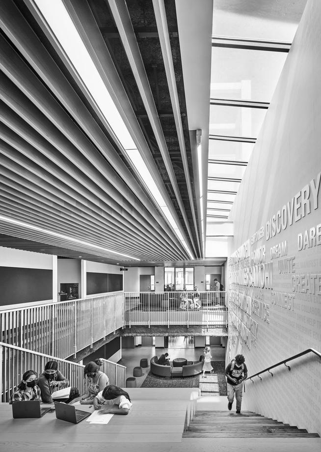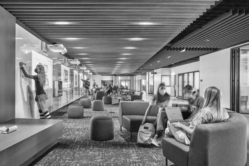 The interior spaces are all organized around common spaces, which provide opportunities for students to gather and learn in a non-traditional way. The curriculum supports diverse teaching and learning styles, and in addition to the classrooms being adaptable to evolving pedagogical approaches and uses, the student population can experience the best possible learning spaces as time progresses.