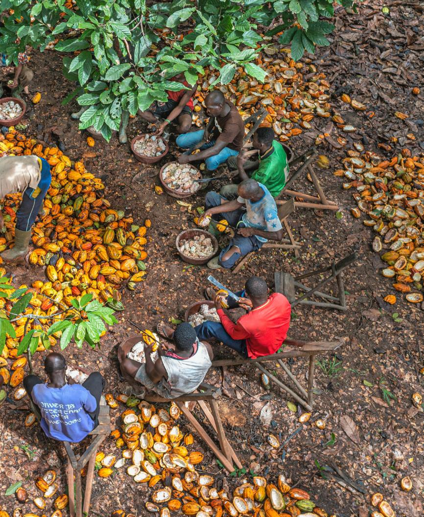 Migros-Moment in der Elfenbeinküste Landwirt Antoine Kramoh-Kouadio (oben links, gemustertes Hemd) öffnet mit Verwandten und Freunden Kakaoschoten, um ihnen Fruchtfleisch und Bohnen zu entnehmen. Seine Plantage gehört zur Kooperative Necaayo, die seit 2012 Rohkakaolieferantin der Migros ist. Die Aufnahme ist am 1. November 2022 entstanden.