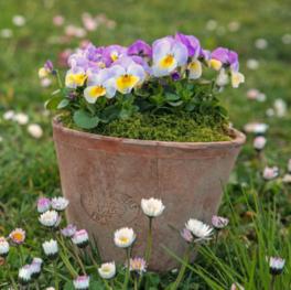 Topferde ins Gefäss geben, sodass dieses ungefähr zu zwei Dritteln voll ist. Pflänzli hineinsetzen.