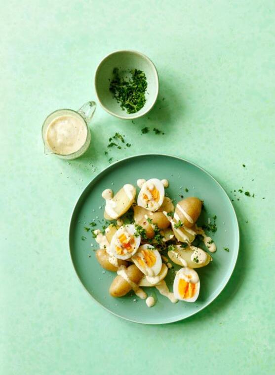 5 dl Béchamelsauce erhitzen, 4 EL grobkörnigen Senf dazurühren und mit Salz und Pfeffer abschmecken. Eier und Kartoffeln mit Sauce anrichten. Mehr Rezepte mit Eiern gibts auf migusto.ch.