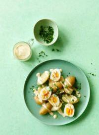 1 kg kleine, festkochende Kartoffeln ca. 20 Minuten gar kochen. 8 Eier ca. 8 Minuten hart kochen.