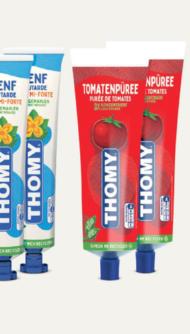 Moutarde douce, mayonnaise, mayonnaise, Thomynaise ou purée de tomates, Thomy p. ex. moutarde douce, 2 x 200 g, 3.65 au lieu de 4.60, (100 g = 0.91)