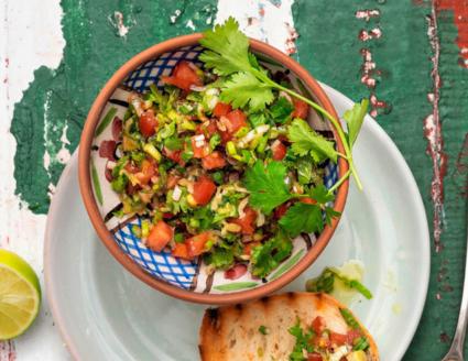 1 Becher griechischen Joghurt nature (180 g) mit 50 g geschnittenen Jalapeños und einem ½ Bund Pfefferminzblätter mit einem Stabmixer pürieren. Mit Salz und Pfeffer abschmecken. Die Hälfte davon mit einem weiteren Becher griechischen Joghurt nature verrühren und kalt stellen.