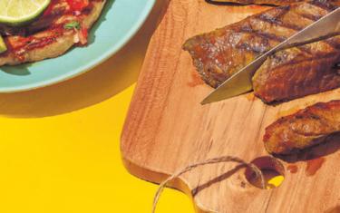À l’aide d’un mixeur plongeur, réduire 50 g de jalapeños en purée avec ½ bouquet de menthe et un pot de yogourt (180 g). Saler et poivrer. Mélanger la moitié de cette sauce avec un autre pot de yogourt et réserver au réfrigérateur. Badigeonner 4 escalopes de poulet avec le reste et le laisser mariner env. 10 min. Chauffer 2 cs d’huile et saisir le poulet env. 8 min à feu moyen. Le servir avec la sauce réservée au réfrigérateur, idéalement avec du pain pita.