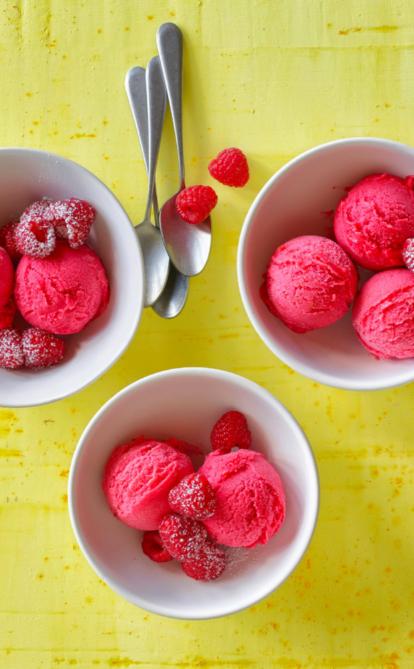 2 dl Wasser und 150 g Puderzucker aufkochen. Ca. 5 Minuten zu einem Sirup einköcheln. Abkühlen lassen. 500 g Himbeeren pürieren, durch ein feines Sieb streichen. Zitronenschale von einer Zitrone dazureiben, Saft dazupressen. 30 g pasteurisiertes Eiweiss steif schlagen und unterheben. In einer Chromstahlschüssel ca. 4 Stunden gefrieren lassen. Masse alle 30 Minuten mit einem Schwingbesen umrühren. Sorbet nach Belieben mit Himbeeren und wenig Puderzucker bestäubt anrichten. Mehr Himbeerrezepte auf migusto.ch