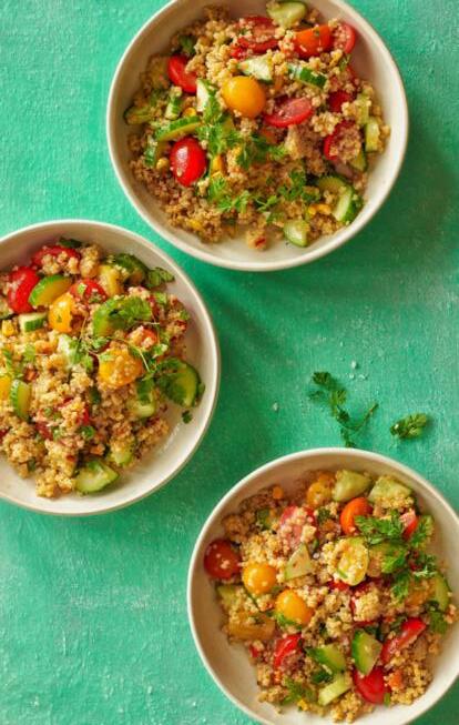 Partager 500 g de tomates cerises en deux, couper un concombre en deux, dans la longueur, puis en menus morceaux et hacher un bouquet de persil plat. Les mélanger tous les trois avec 500 g de quinoa (cuit selon les indications) et 6 cs de sauce à salade, saler et poivrer. Selon les goûts, dresser avec quelques feuilles de fines herbes.