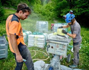 Le mélange du béton, par l’entreprise MTM Maret, se fait au-dessus de la zone escarpée. Il servira à ancrer les câbles dans la paroi.