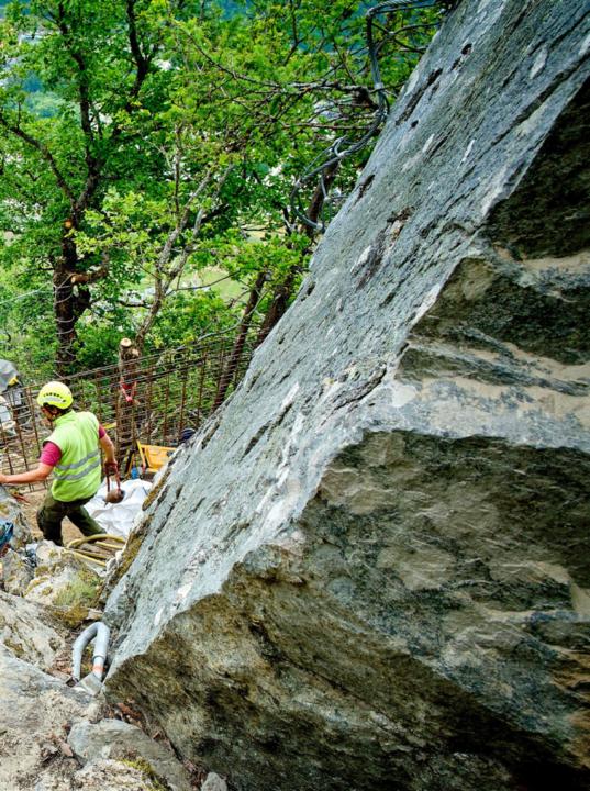 Pour eux, c’est un simple «talus». C’est ainsi que les spécialistes de MTM Maret, une entreprise spécialisée en travaux de génie civil en terrain difficile, nomment l’endroit. Pour le commun des mortels, le «talus» en question est tellement escarpé qu’il faut se tenir à une corde pour y accéder. Avec câbles, tiges et filets en métal fixés dans le sol avec du béton, l’équipe est en train de sécuriser un rocher – pour que la presque catastrophe du 15 mars ne se reproduise pas.