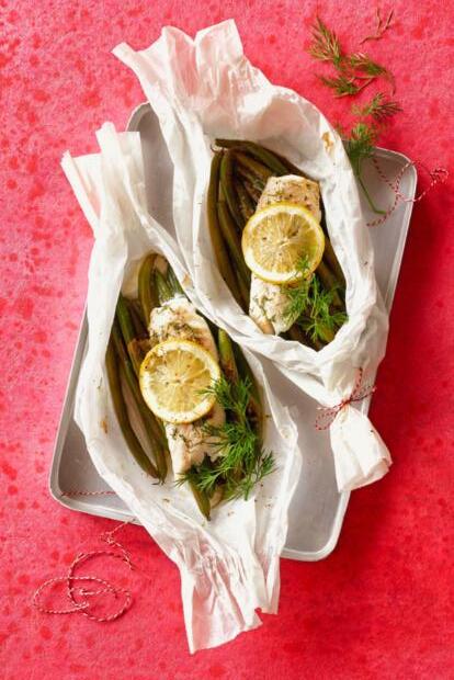 Prendre 1 citron, en couper 4 rondelles, puis râper le zeste du reste et en exprimer le jus. Hacher un demi-bouquet d’aneth, le mélanger avec 6 cs d’huile, le zeste et le jus du citron. En badigeonner 4 filets de cabillaud surgelés de 150 g, décongelés au préalable, et laisser mariner env. 10 min. Parer 500 g de haricots verts, les cuire env. 5 min dans de l’eau salée amenée à ébullition et égoutter. Préchauffer le four à 180 °C, chaleur tournante. Répartir les haricots sur quatre feuilles de papier sulfurisé, ajouter les filets avec leur marinade et déposer une rondelle de citron sur chacun d’eux. Saler et poivrer. Refermer en papillote, lier les extrémités avec du fil de cuisine et déposer sur une plaque. Cuire 15 à 20 min au milieu du four. Idéal avec du riz. Plus de recettes avec du poisson sur migusto.ch