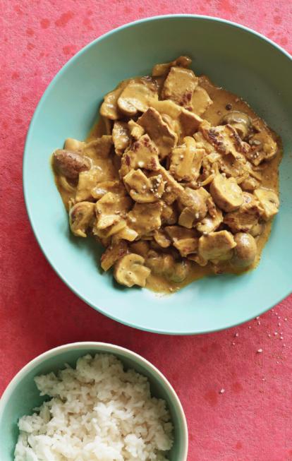 2,5 dl Currysauce und 1 dl Wasser dazugiessen und aufkochen. Mit Salz und Pfeffer abschmecken.