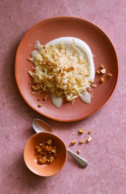 La veille, glisser 4 bananes préalablement pelées dans un sachet et mettre au congélateur pour la nuit. Le jour même, hacher 50 g de noix de cajou au miel et au sel de mer. Répartir 360 g de yogourt à la grecque nature dans 4 assiettes. Râper les bananes sur une râpe à rösti et les dresser sur le yogourt. Ajouter 3 cs de lait condensé sur chaque garniture et les parsemer d’éclats de noix de cajou. Savourer aussitôt. Plus de recettes avec du yogourt sur migusto.ch