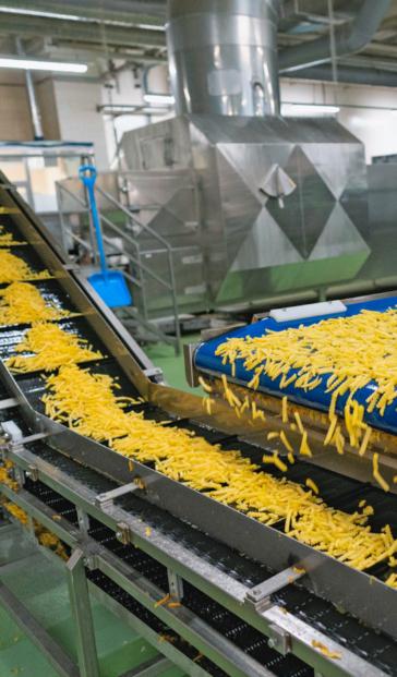 Dans la pièce suivante, des machines découpent les pommes de terre en forme de frites. Celles qui sont trop courtes sont triées et transformées plus tard en flocons de pommes de terre. Avant de passer à la friteuse, les frites sont précuites deux fois dans de l’eau chaude pour éviter qu’elles ne brunissent par la suite.