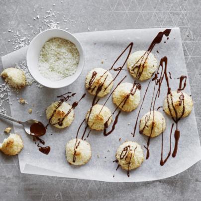 Préchauffer le four à 170 °C, chaleur de voûte et de sole. Monter 2 gros blancs d’œuf en neige avec ½ cc de sel. Ajouter 130 g de sucre en pluie et continuer à fouetter jusqu’à ce que la masse brille. Incorporer 150 g de noix de coco râpée. Prélever des portions de la taille d’une noix, les façonner en boule et les déposer sur une plaque chemisée de papier sulfurisé en les espaçant suffisamment. Former des pointes du bout du doigt. Glisser la plaque au four et cuire 13-15 min jusqu’à légère coloration. Retirer les macarons et les laisser tiédir. Entre-temps, morceler 100 g de chocolat noir et le faire fondre au bain-marie. Décorer les macarons de chocolat fondu et laisser durcir.