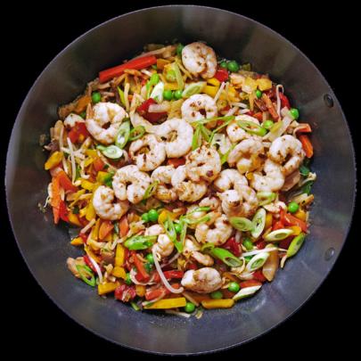Chauffer 1 cs d’huile dans la même poêle, saisir à feu vif 500 g de crevettes surgelées décongelées, remettre les légumes, relever avec env. 4 cs de sauce soja et poivrer. Servir parsemé de vert d’oignon. Accompagner de riz.