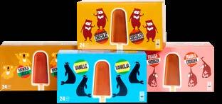 Bâtonnets de crème glacée produits surgelés, vanille, chocolat, fraise et moka, 24 x 57 ml, (100 ml = 0.53)