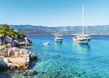 5: Ücagiz–Simena–Kekova–Gökkaya Nach dem Frühstück Fahrt nach Simena. Besichtigung der Ruinen und Mittagessen. Weiterfahrt entlang der versunkenen Stadt Kekova in die Gökkaya-Bucht. Nachtessen und Übernachtung an Bord.