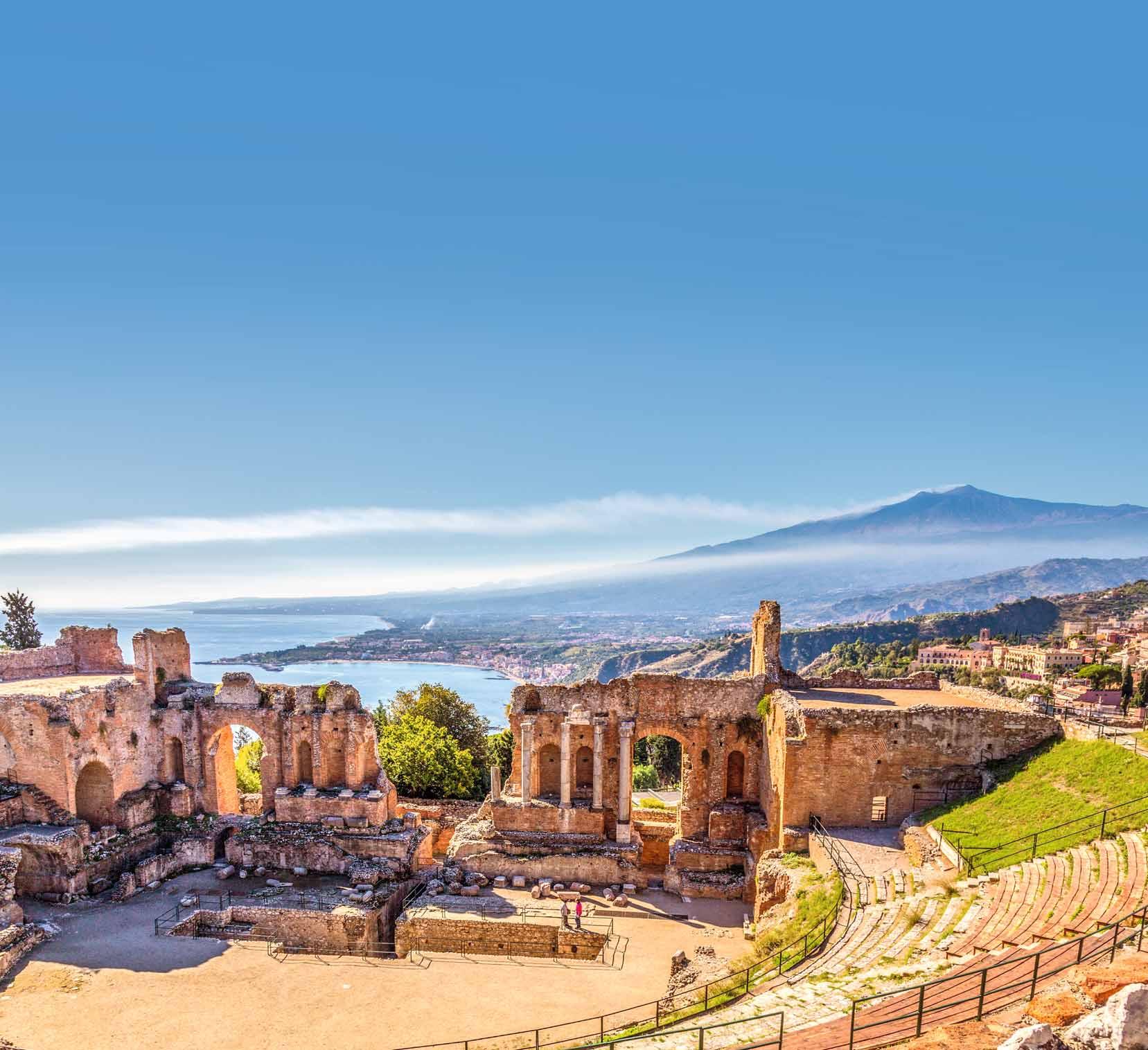 7: Cefalù–Taormina, ca. 220 km Fahrt nach Taormina, der Perle Siziliens, die auf einer felsigen Hochebene liegt. Ein Muss ist die Besichtigung des griechischen Theaters, das umgeben von Kaktusfeigen und Zypressen ist. Auch ein Spaziergang entlang der lebhaften Geschäfts- und Flaniermeile Corso Umberto I. darf nicht fehlen. Hier finden