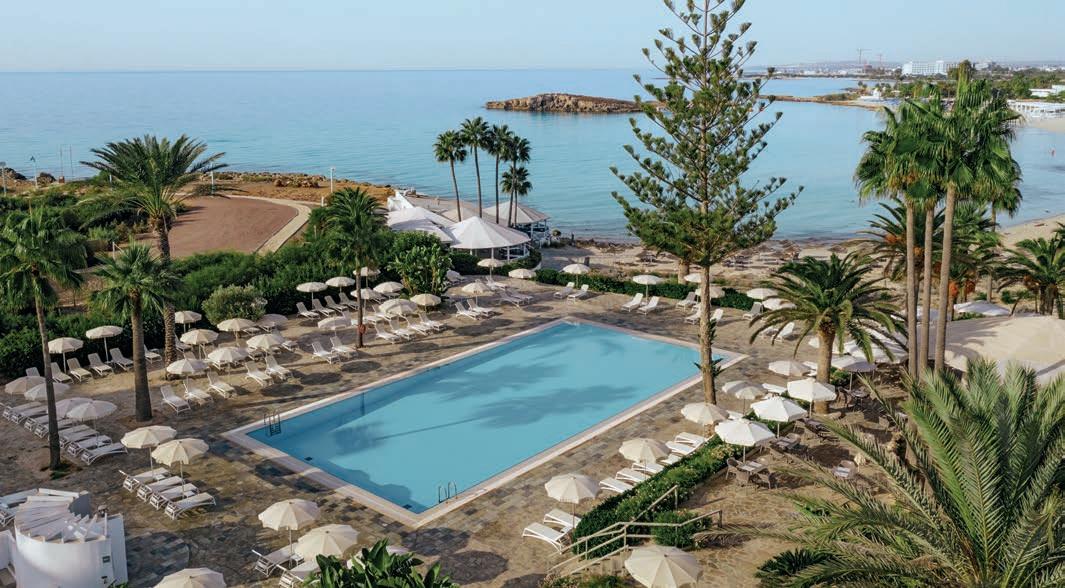 Lage: Direkt am Sandstrand teils mit Felsen am Wasserrand. Der Einstieg ins Wasser erfolgt über die kleine Bucht oder den Steg. Bis zum Flughafen Paphos sind es rund 15 km, zum Flughafen Larnaca knapp 140 km. Infrastruktur: Empfangshalle mit Panoramablick auf das Meer, Réception und WLAN (gratis). Buffet-Hauptrestaurant, vier A-la-carte-Restaurants, zwei Poolbars (eine nur für Erwachsene), Strand-/Snackbar. Spielezimmer, Minimarkt, Juwelier, Coiffeur. Im Aussenbereich befindet sich eine gepflegte Gartenanlage mit vier Süsswasserpools (einer davon nur für Erwachsene), zwei Whirlpools und Sonnenterrassen.