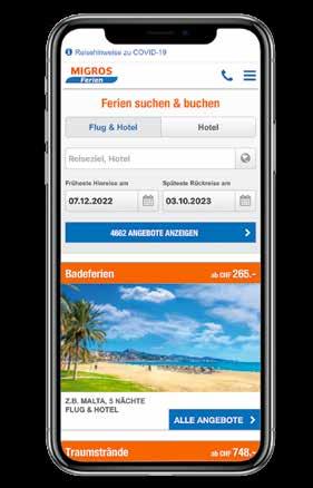 HORIZON BEACH HOTEL DER DIREKTE EINSTIEG INS MEER, DIE INSELTYPISCHE ARCHITEKTUR, DER FREUNDLICHE SERVICE UND DER HOTELEIGENE WASSERPARK SIND IDEALE VORAUSSETZUNGEN FÜR ERHOLSAME FERIEN. Mehr Info: www.migros-ferien.ch/h-435247 KRETA 230 ab 846 Tripadvisor Bewertungen ALL INCLUSIVE ab 460.–1 Woche pro Person, ab Zürich mit Aegean z.B. am 21.10.23 WEITERE ANGEBOTE: MIGROS-FERIEN.CH GRATIS-BUCHUNGS-NUMMER 0800 88 88 12 IMMER IM PREIS INBEGRIFFEN: ✓ Gratis-B uchungs-Nummer 0800 88 88 12 ✓ Buchungsgebühren ✓ Anzahl gebuchte Nächte im Hotel ✓ Flug hin und zurück in Economy Class mit bewährten Fluggesellschaften ✓ 20 kg Freigepäck ✓ Flughafen- und Sicherheitstaxen in der Schweiz sowie im Ferienland ✓ Basisbetreuung am Ferienort LAGAS AEGEAN VILLAGE DIESES HOTEL IST WIE EIN KLEINES GRIECHISCHES DORF AN DEN HANG GEBAUT UND BIETET VON DEN ZIMMERN AUS EINE WUNDERSCHÖNE AUSSICHT AUF DAS MEER UND DIE VORGELAGERTE INSEL. Mehr Info: www.migros-ferien.ch/h-15850 KOS 266 ab 1391 Tripadvisor Bewertungen HALBPENSION ab 532.–1 Woche pro Person, ab Zürich mit Edelweiss, z.B. am 11.5.23 FÜR MYSTISCHE FERIENMOMENTE. Griechenland KALIMERA KRITI HOTEL & VILLAGE RESORT BELIEBTE, ERSTKLASSIGE HOTEL- UND BUNGALOWANLAGE IM KRETISCHEN STIL UNTER DERSELBEN LEITUNG WIE DAS HOTEL KERNOS BEACH. IDEAL FÜR FAMILIEN- UND STRANDFERIEN. Mehr Info: www.migros-ferien.ch/h-1022 KRETA 280 ab 922 Tripadvisor Bewertungen HALBPENSION ab 559.–1 Woche pro Person, ab Bern mit Helvetic Airways z.B. am 28.6.23 AEOLOS BEACH RESORT WEITLÄUFIGE, SCHÖNE FERIENANLAGE MITTEN IN EINEM ÜPPIGEN GARTEN MIT ZAHLREICHEN OLIVENBÄUMEN UND FANTASTISCHEM PANORAMABLICK AUF DAS IONISCHE MEER. Mehr Info: www.migros-ferien.ch/h-683 KORFU 394 ab 2461 Tripadvisor Bewertungen ALL-INCLUSIVE
