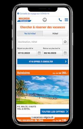 Ligne de réservation gratuite 0800 88 88 12 vacances-migros.ch DE JANVIER À OCTOBRE 2023 du 13.1 au 30.1.2023 sur tout l’assortiment de Vacances Migros en ligne et dans la brochure 5x BALNÉAIRES VACANCES EN TRAIN MÉTROPOLES PARCS D’ATTRACTIONS CIRCUITS