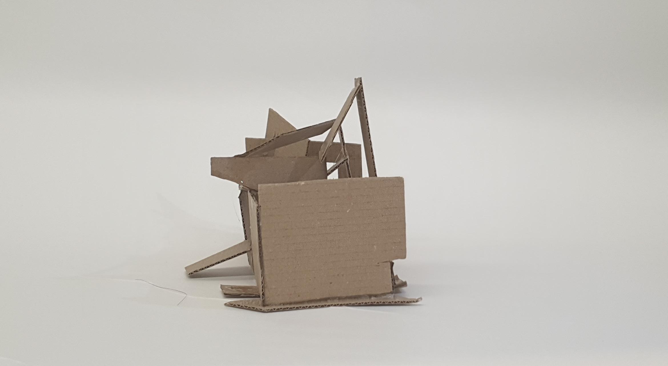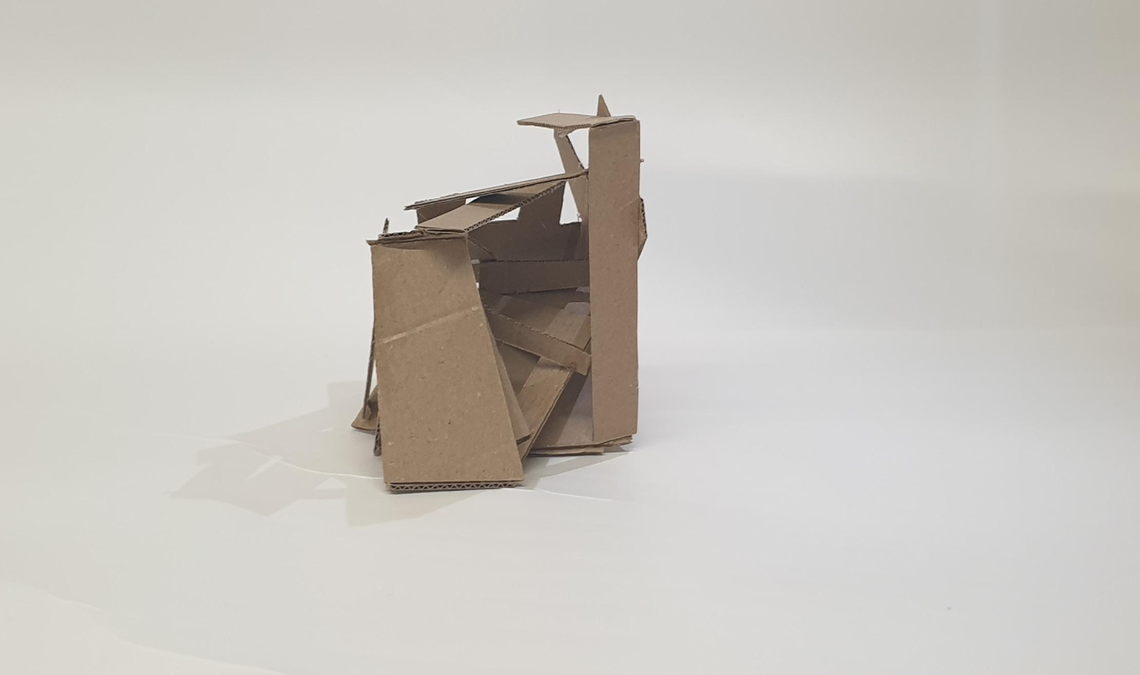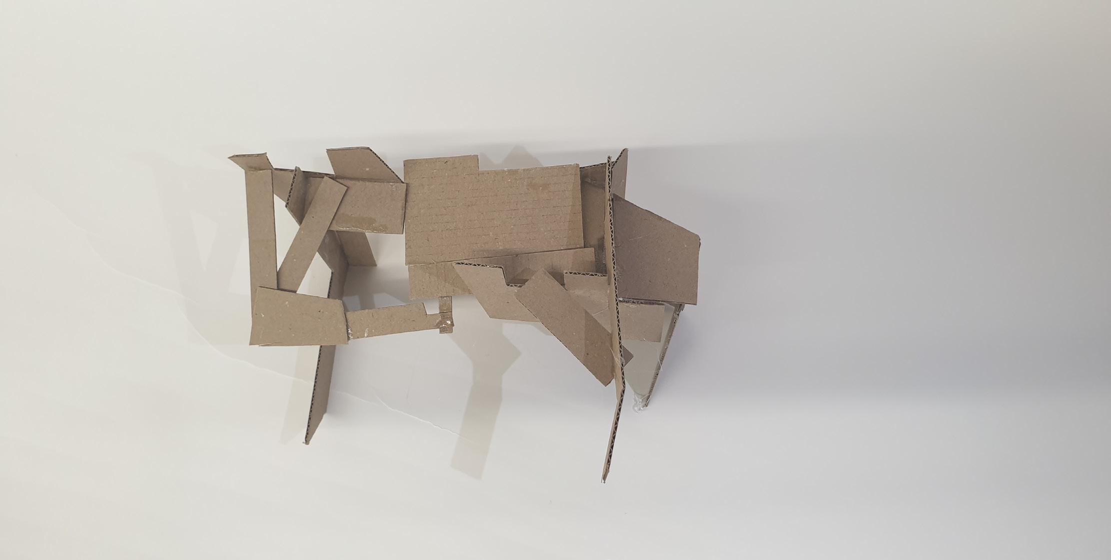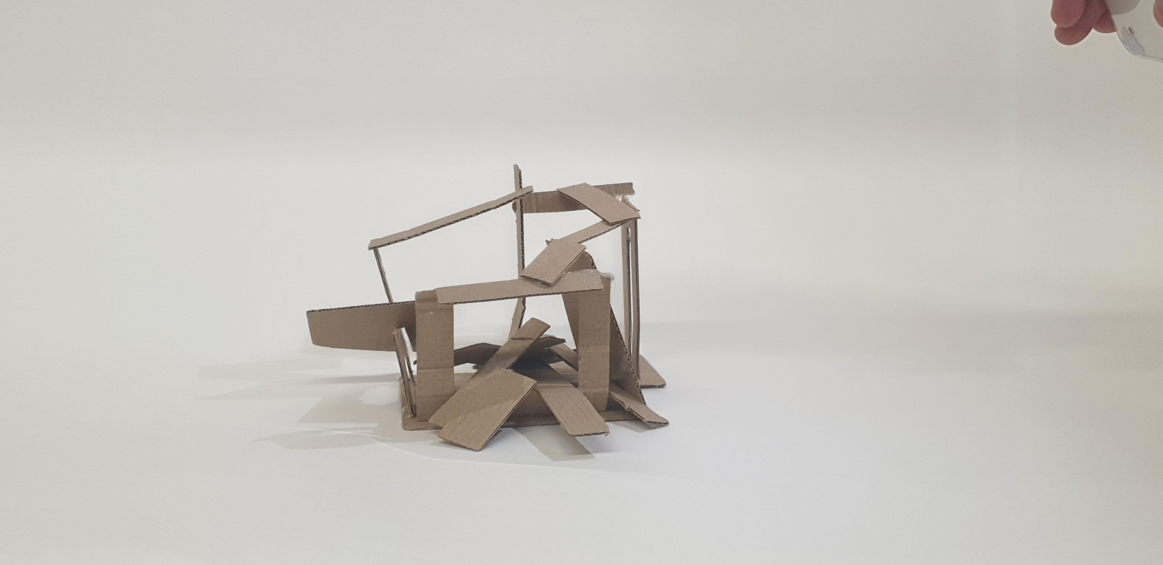 Making gate-looking shapes around the small model allowed light to be seen from big spaces to small gaps inside the model. This model is my favourite as it's simple but powerful at the same time. I used less glue, which allowed the pieces to stay in the position I wanted them to stay.