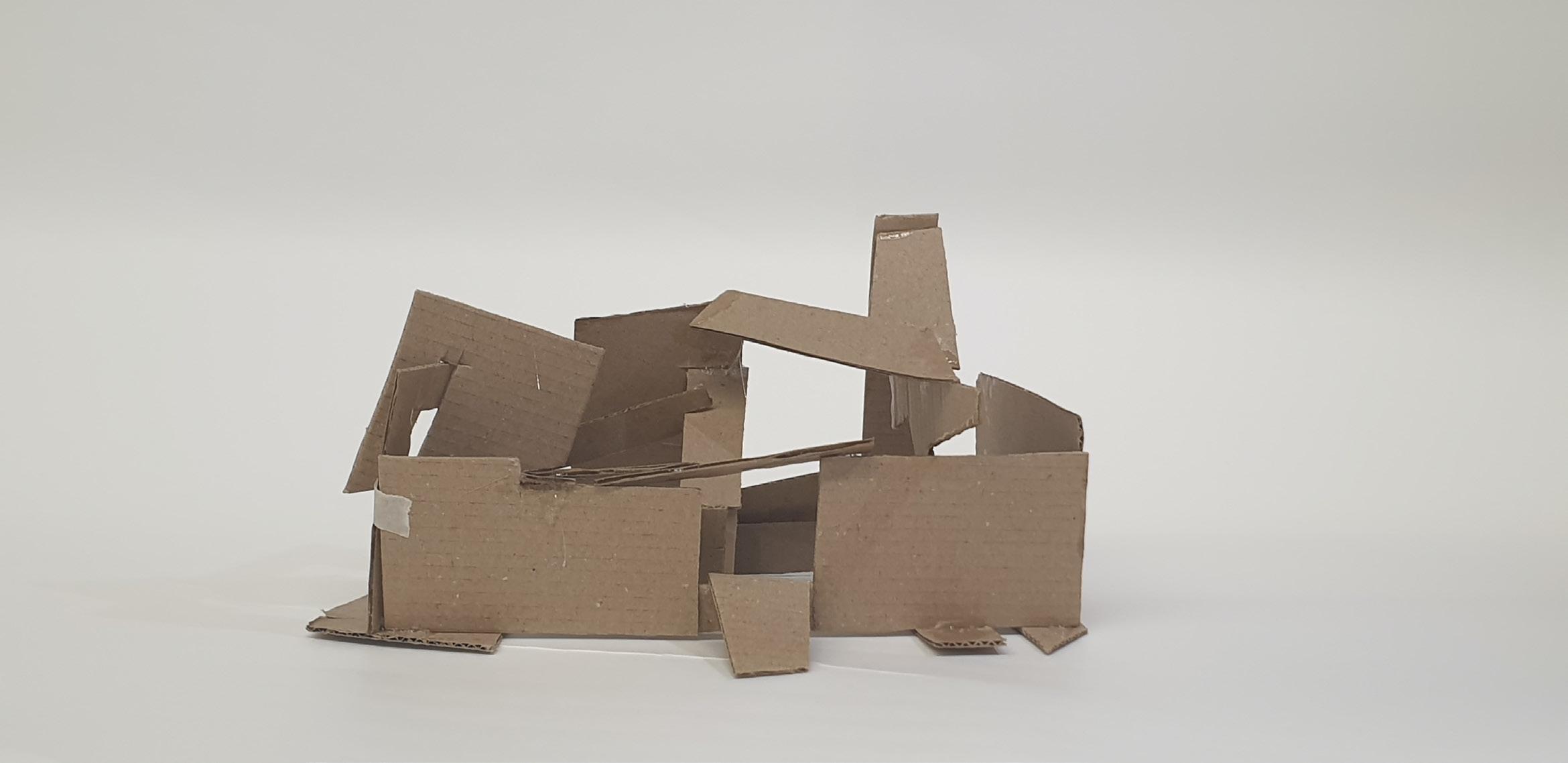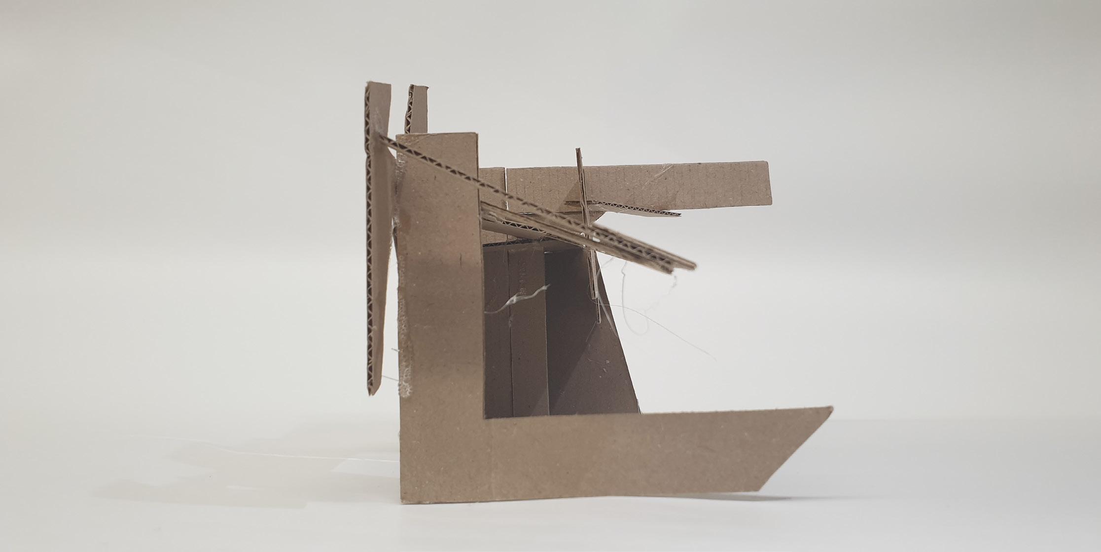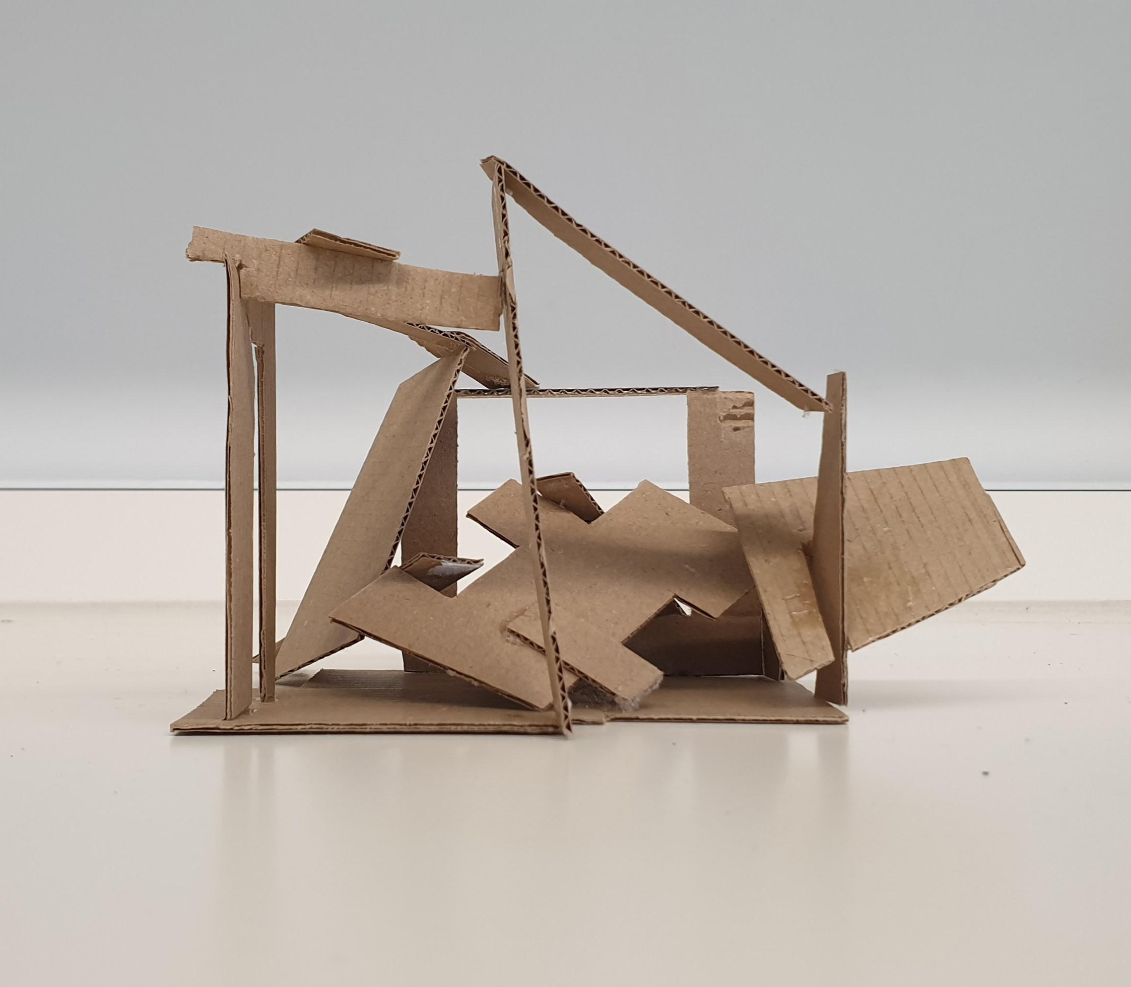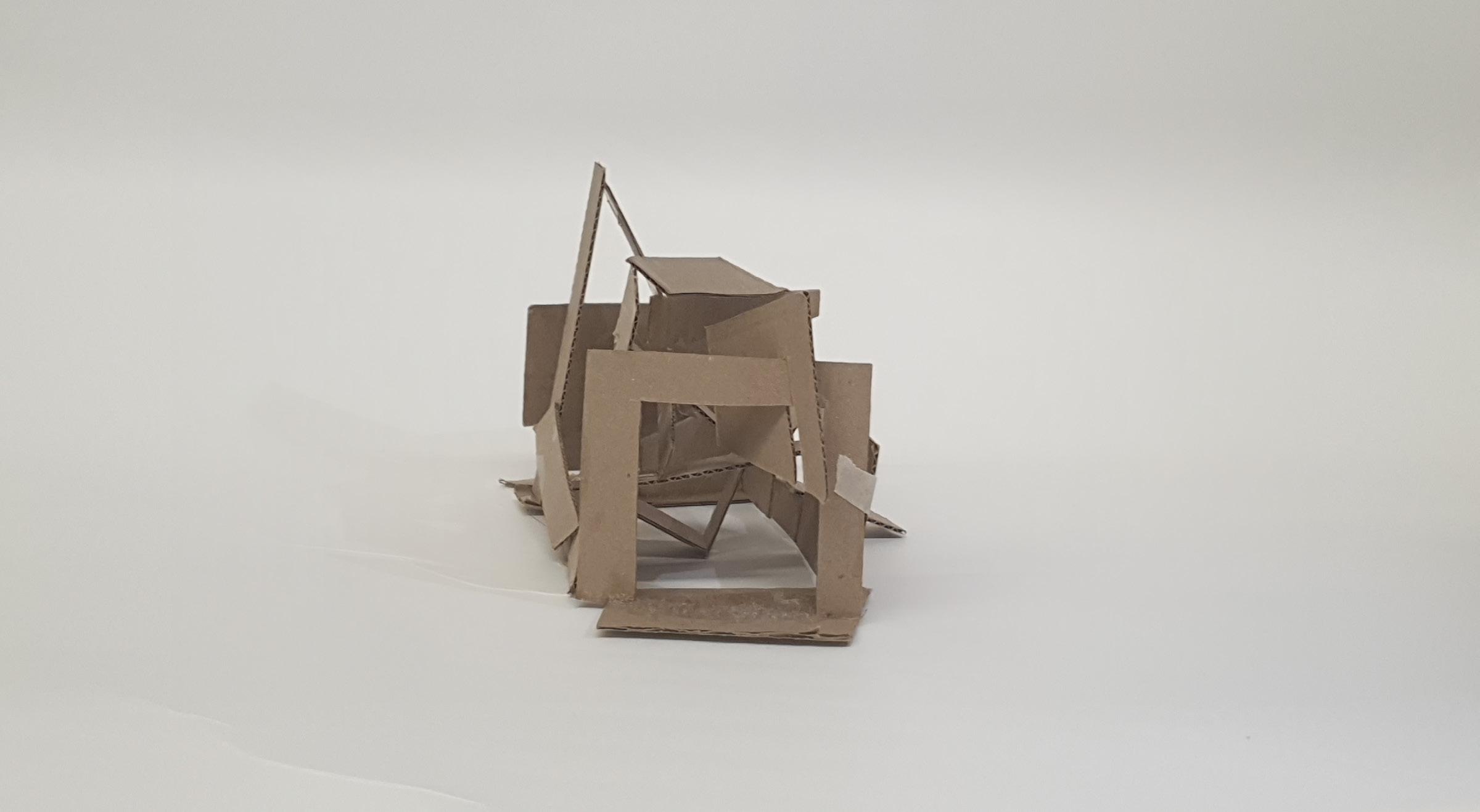 Making gate-looking shapes around the small model allowed light to be seen from big spaces to small gaps inside the model. This model is my favourite as it's simple but powerful at the same time. I used less glue, which allowed the pieces to stay in the position I wanted them to stay.