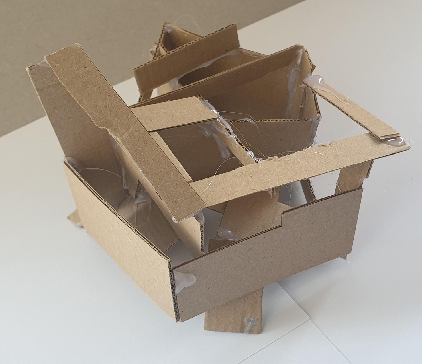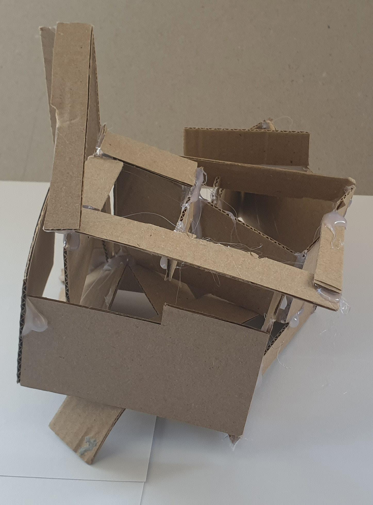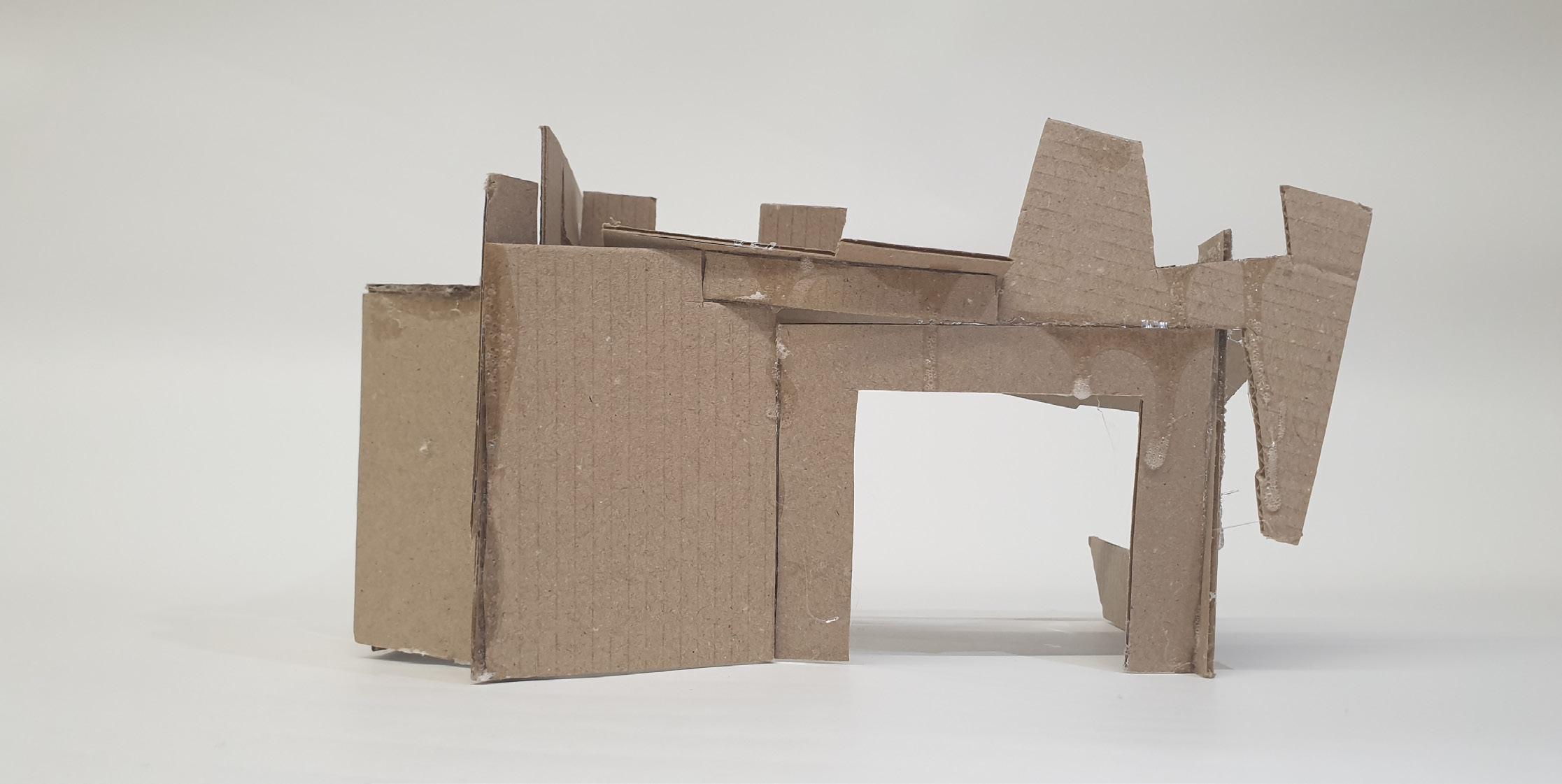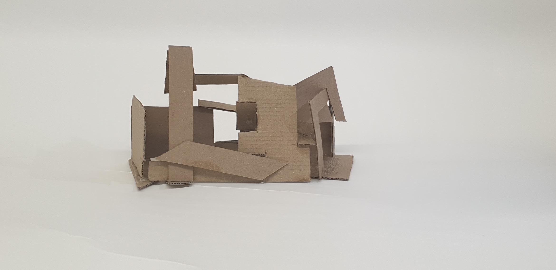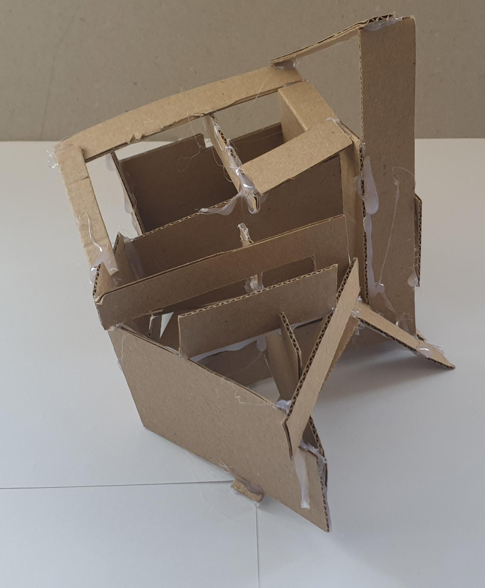Making gate-looking shapes around the small model allowed light to be seen from big spaces to small gaps inside the model. This model is my favourite as it's simple but powerful at the same time. I used less glue, which allowed the pieces to stay in the position I wanted them to stay.