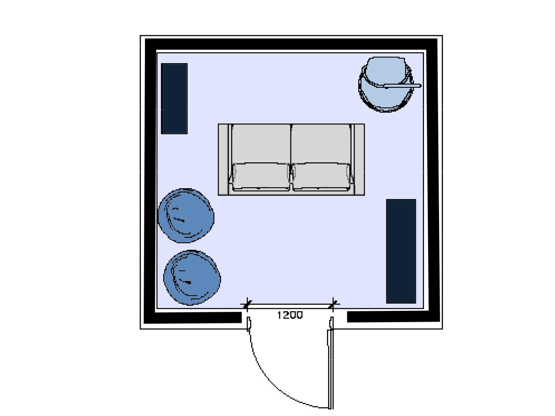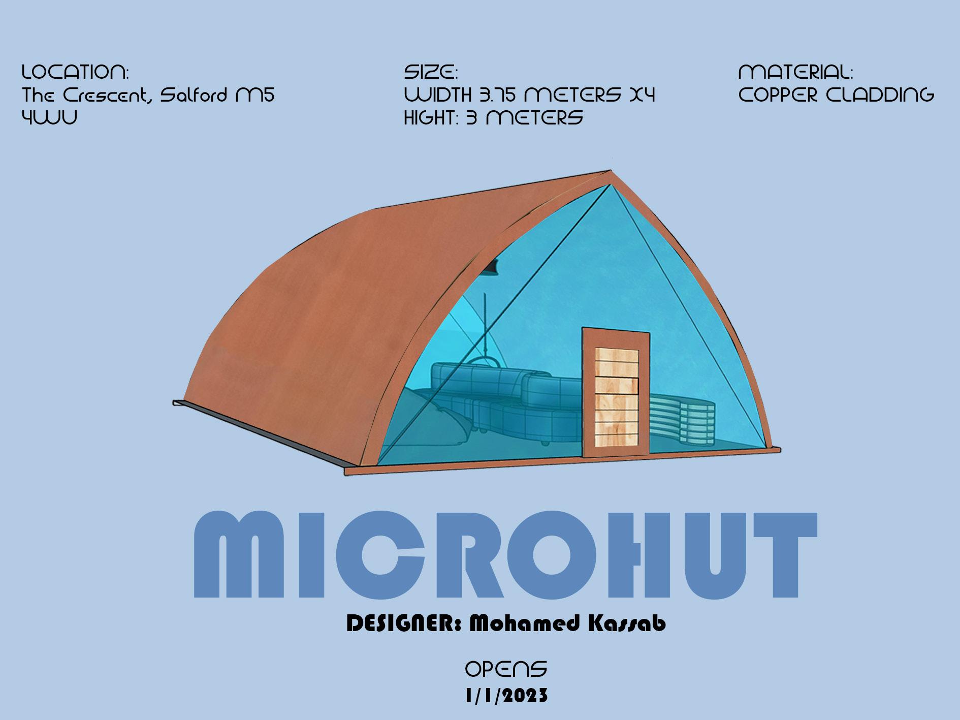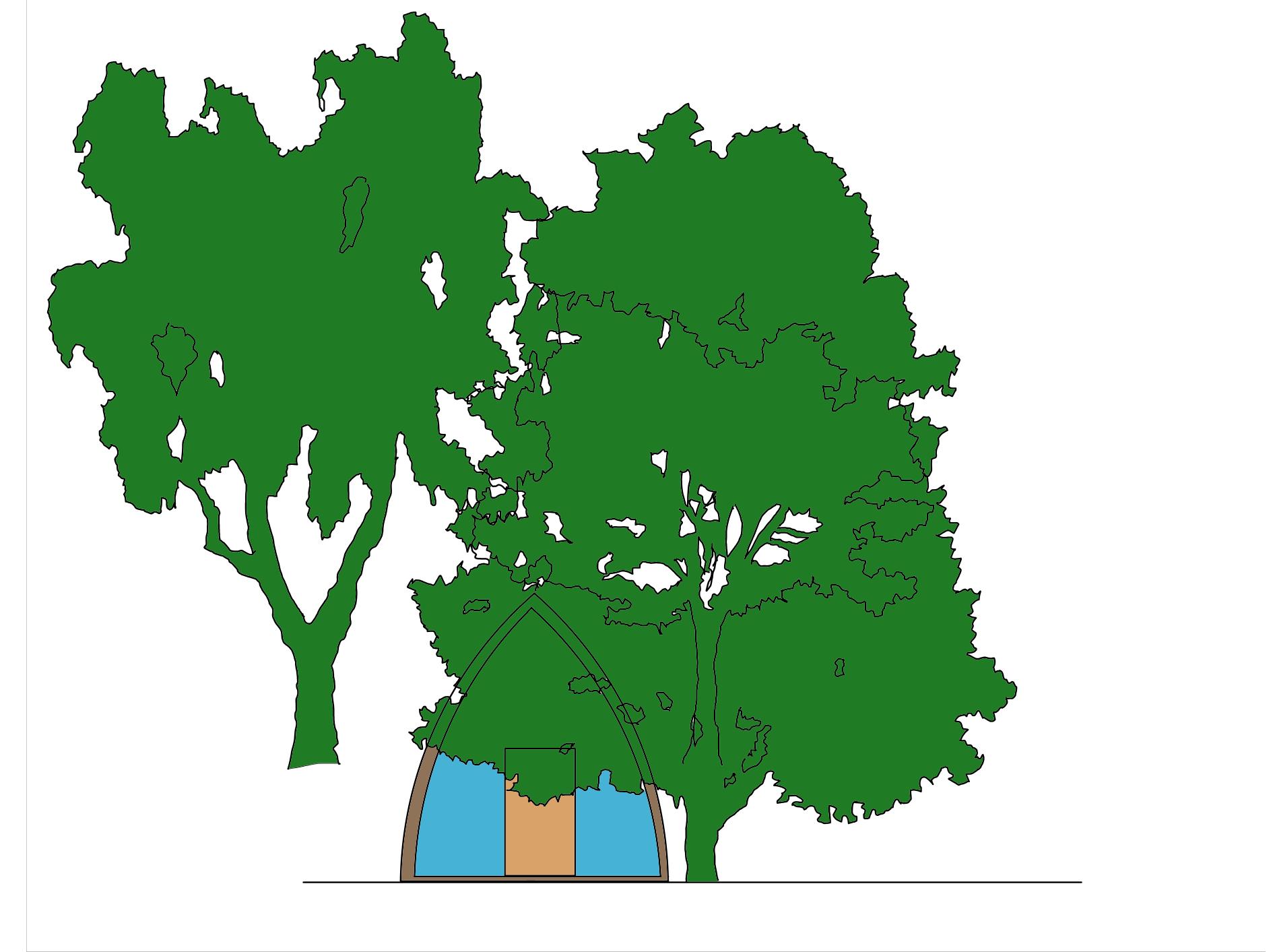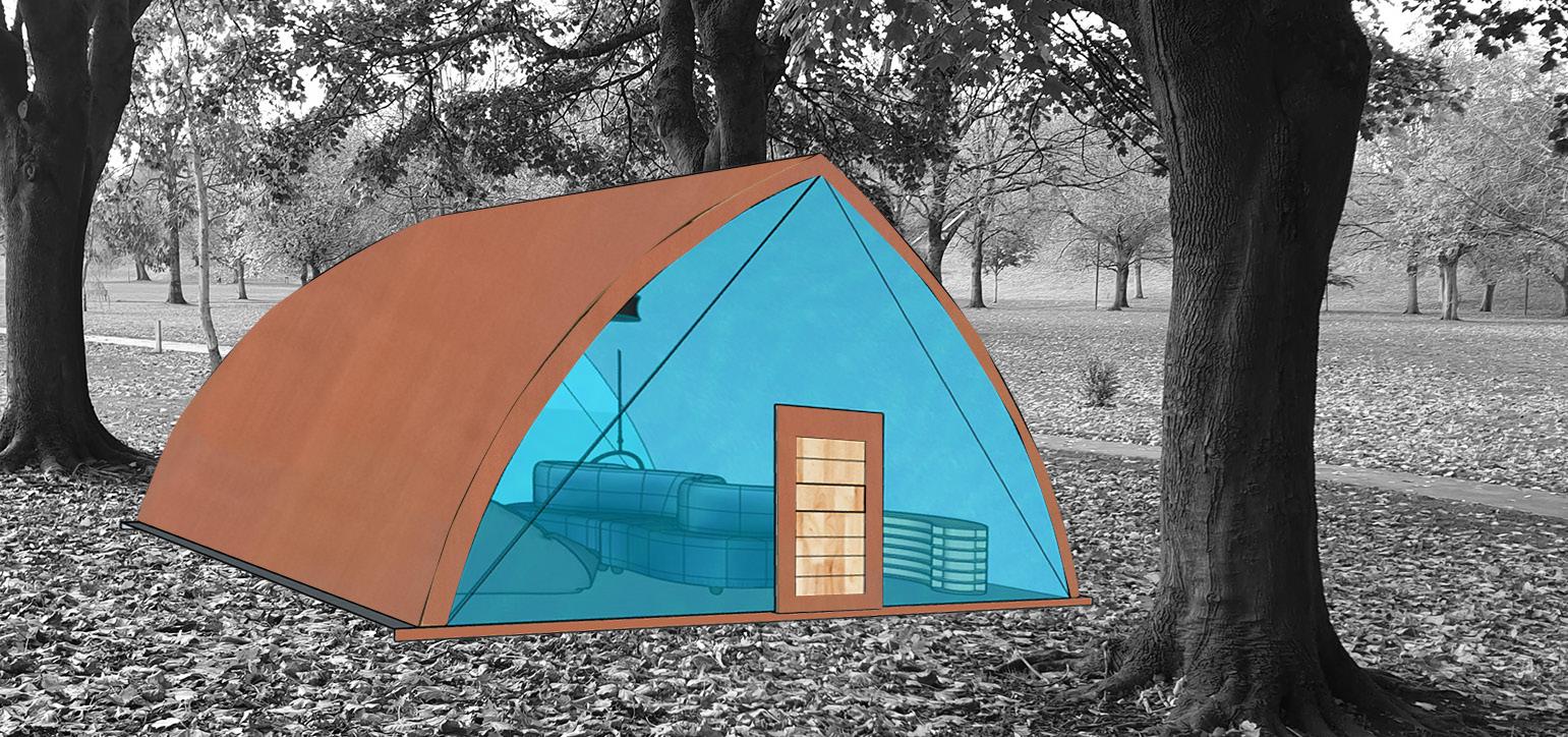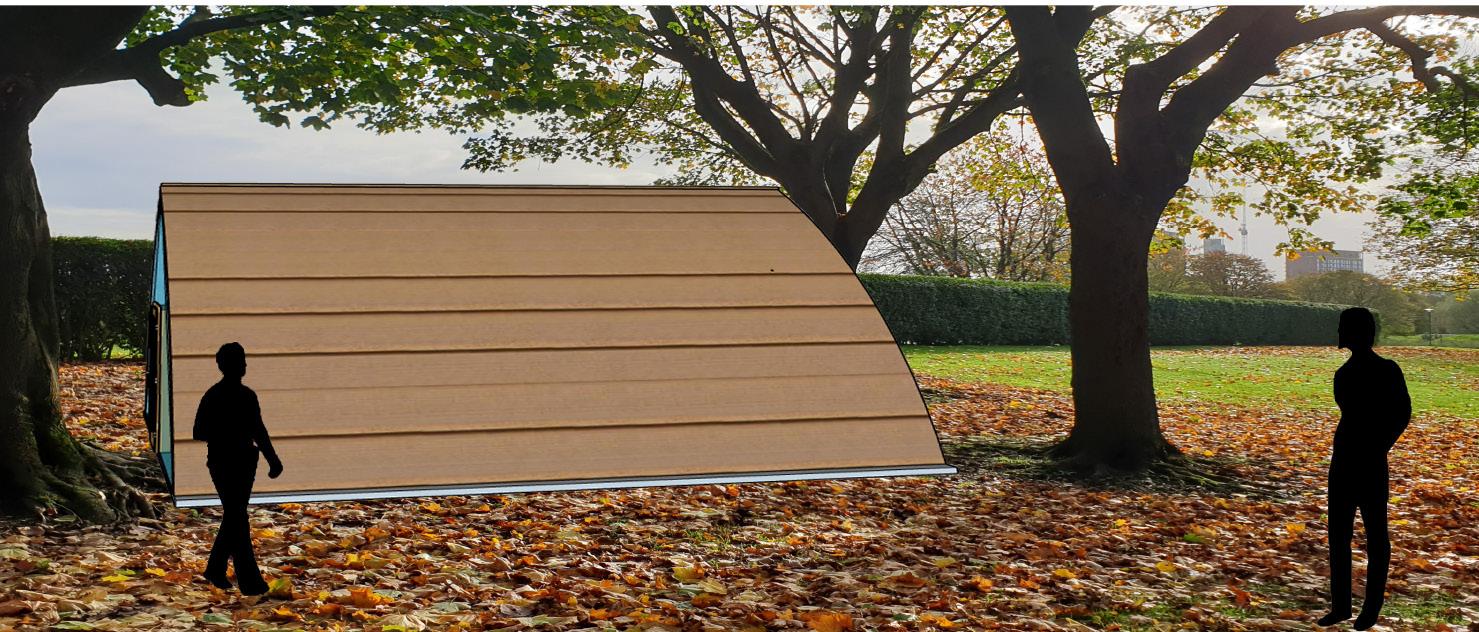 IDEA 1 floor 1 room Inside= silver and blue Outside=copper cladding/brown to blend in with the grass/ surroundings Inside Hammock sofas and cushions Bookshelf Beanbags copper cladding