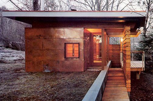 This house design is inspired by a mountain cabin. The materials used to allow it to blend in with nature. It's made from copper cladding as it’s resistant to wind and rain. This material works for this house because it is located on the side of a river and makes it suitable for staying in. The blending in makes the house special as it has glass around it, but it still blends in well. This is because the lights inside the house are the same col our as the copper cladding.