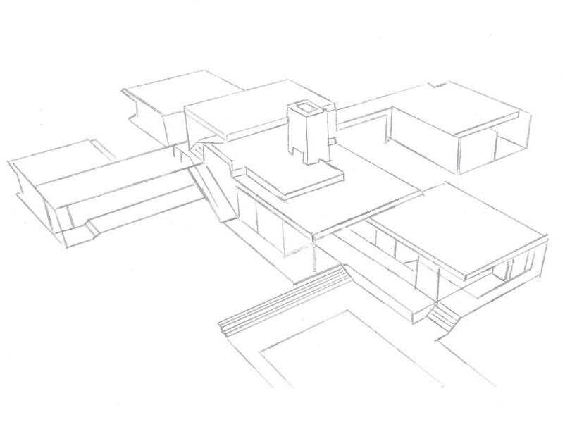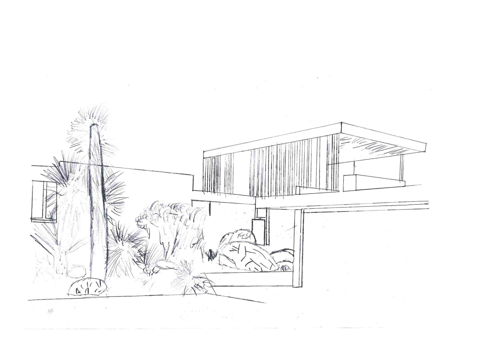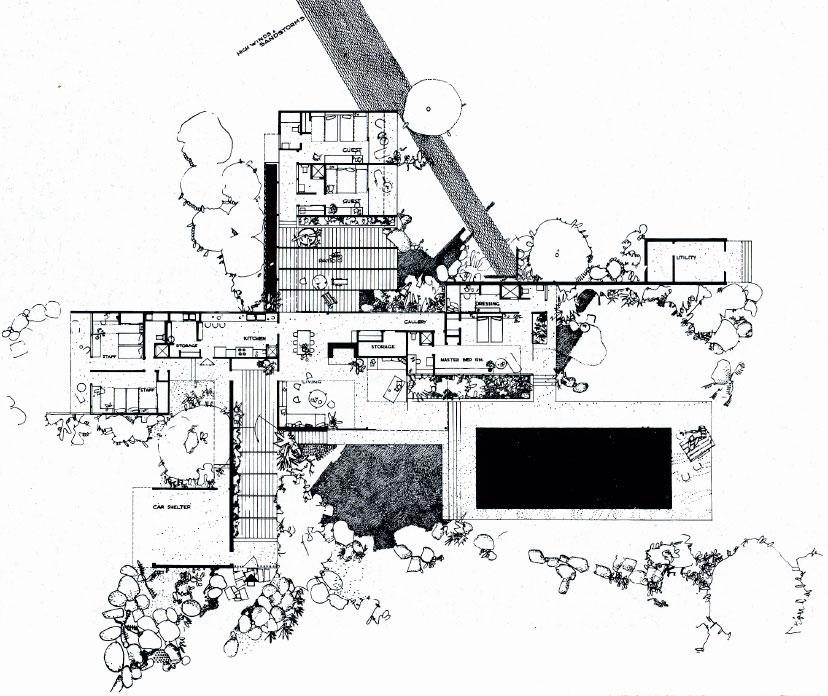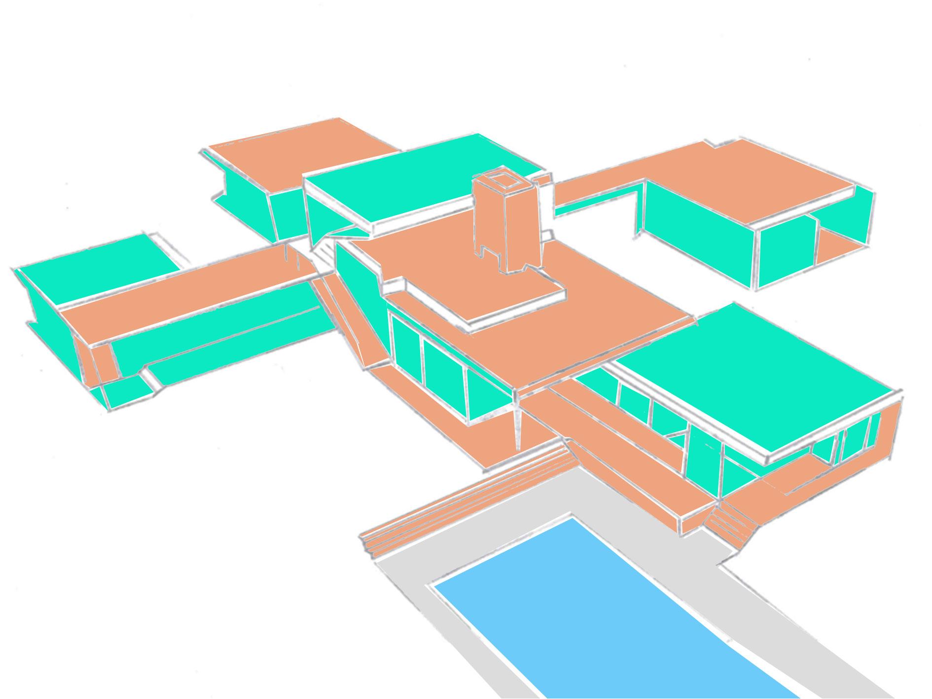 The unique sharp vertical feature is the chimney located next to the “public square”, as Neutra called it.