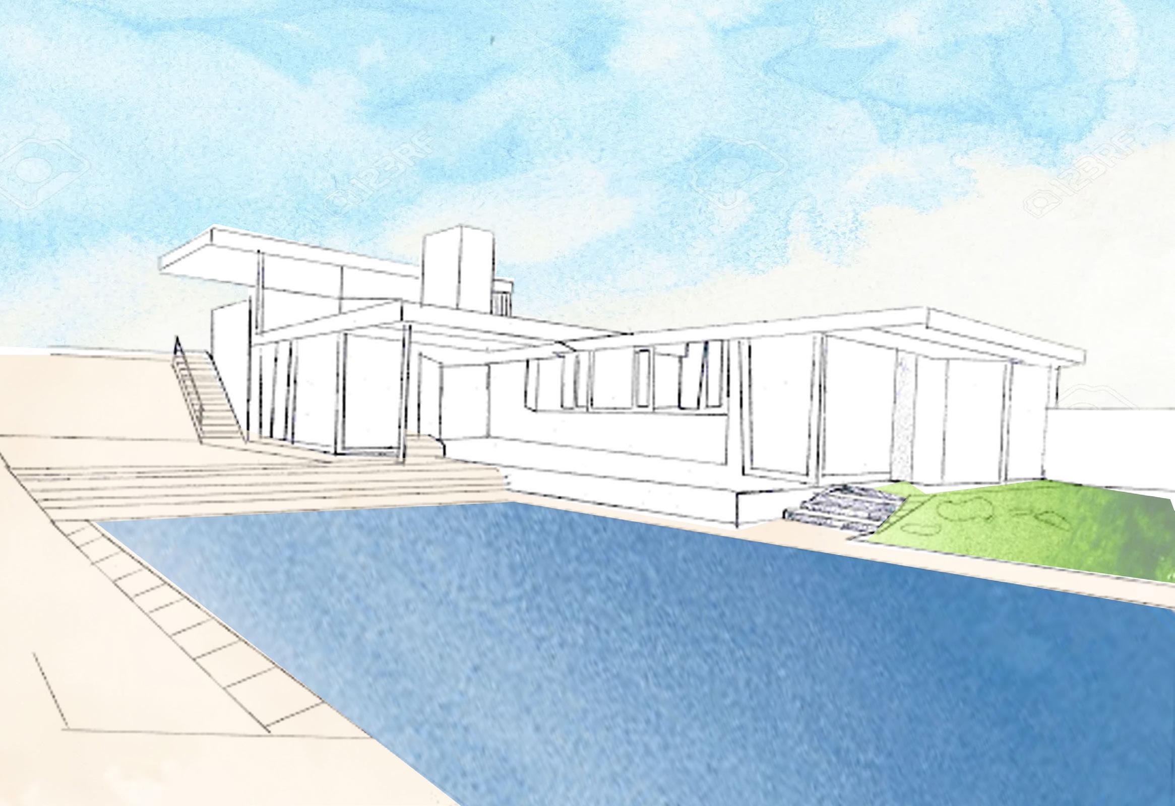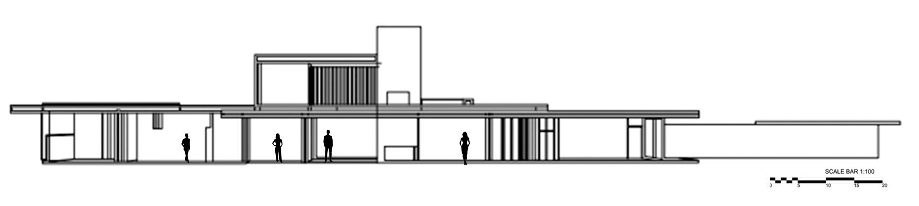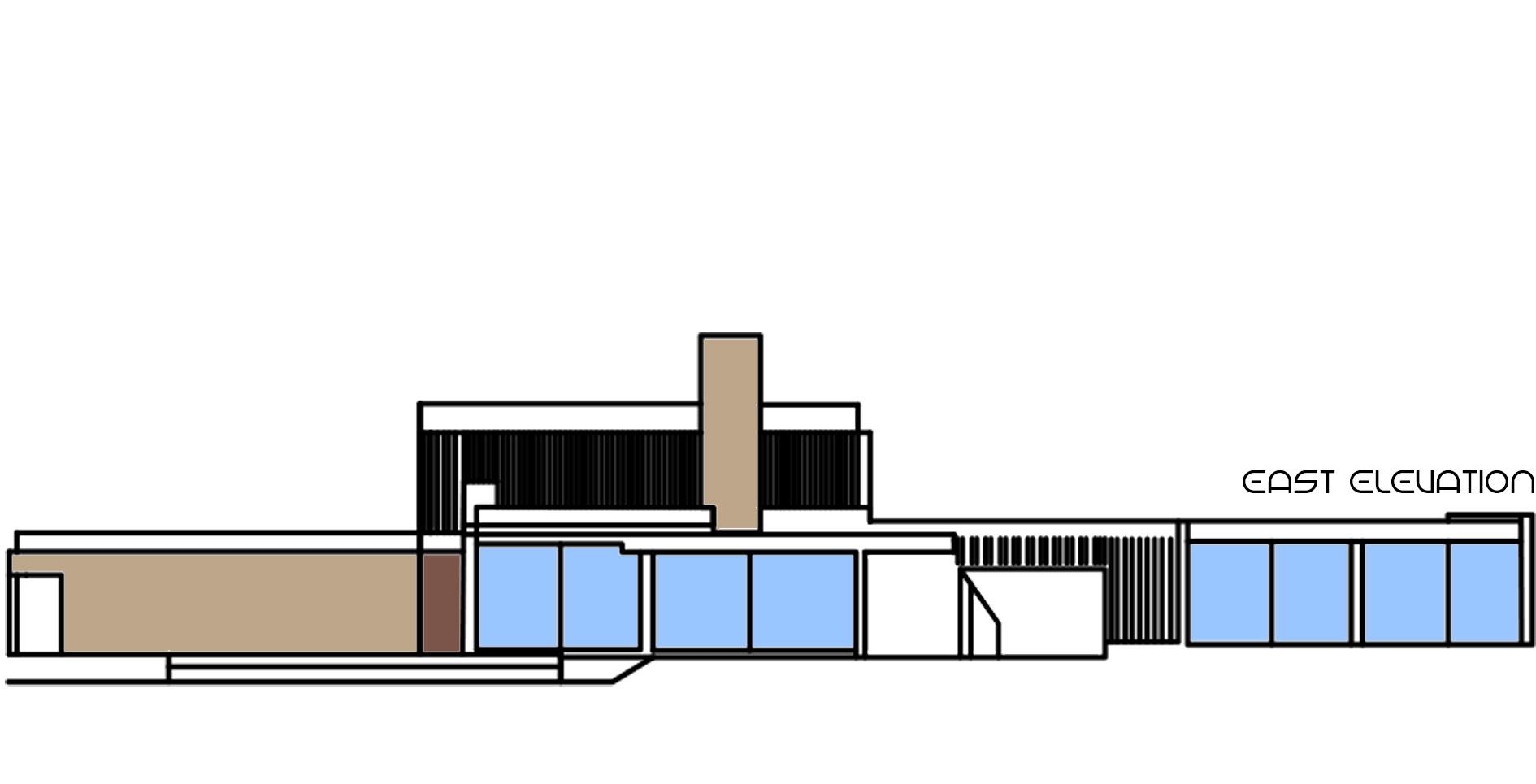 The unique sharp vertical feature is the chimney located next to the “public square”, as Neutra called it.