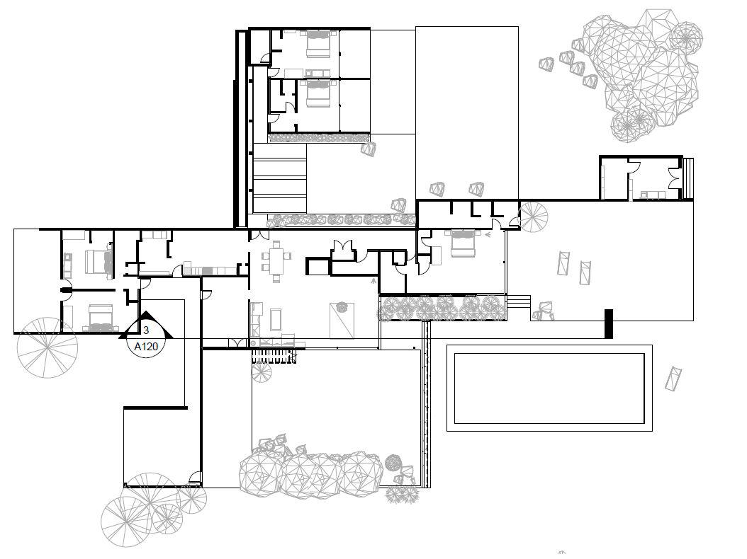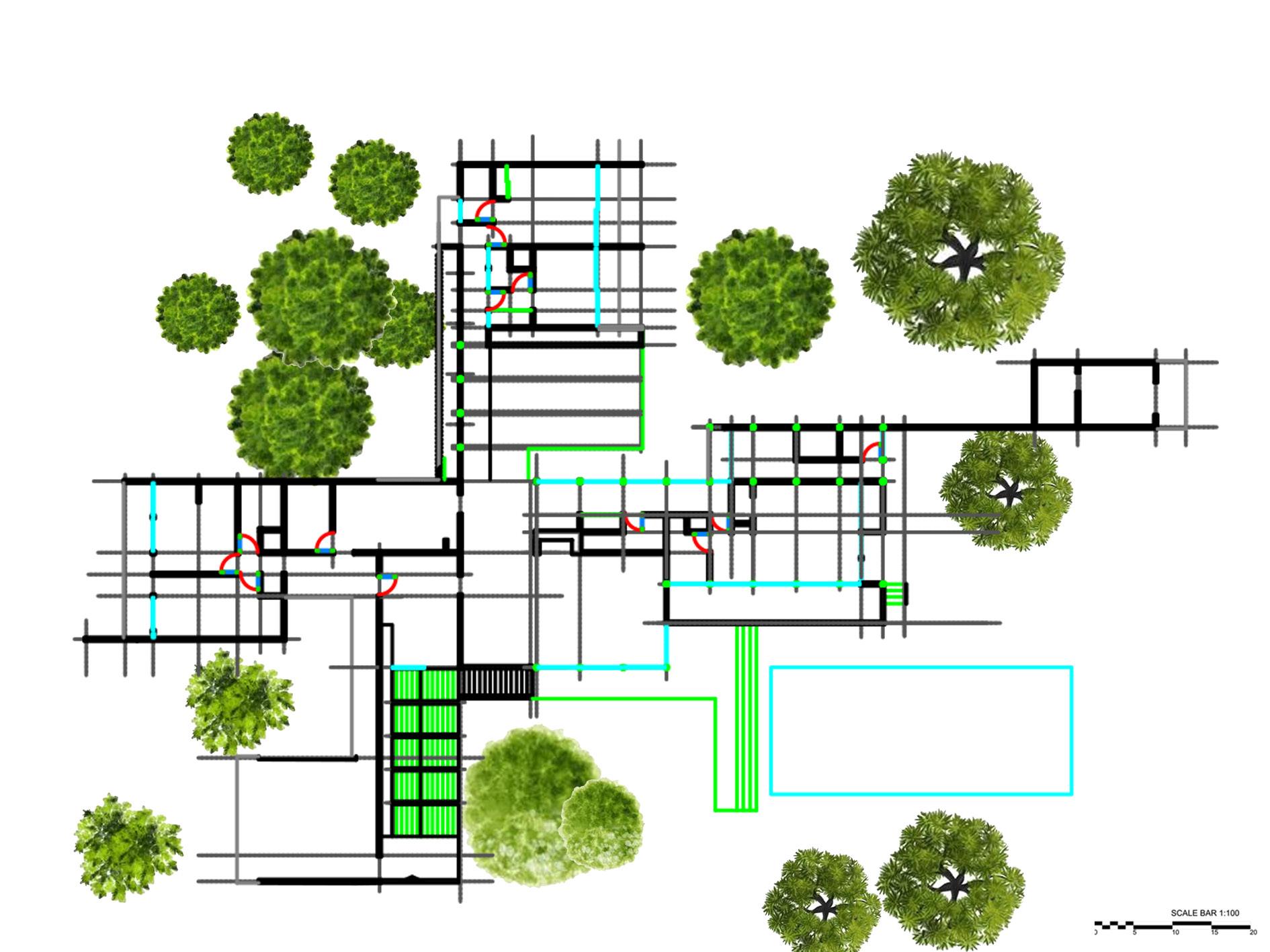 one wing of the house sits on an east-west axis, and the other sits perpendicular or to the cardinal directions to expand the areas of residence.