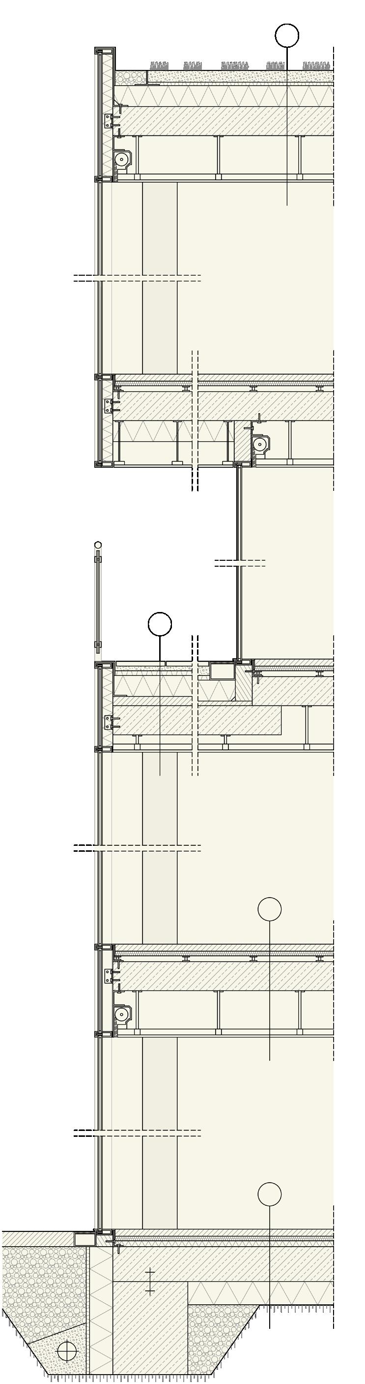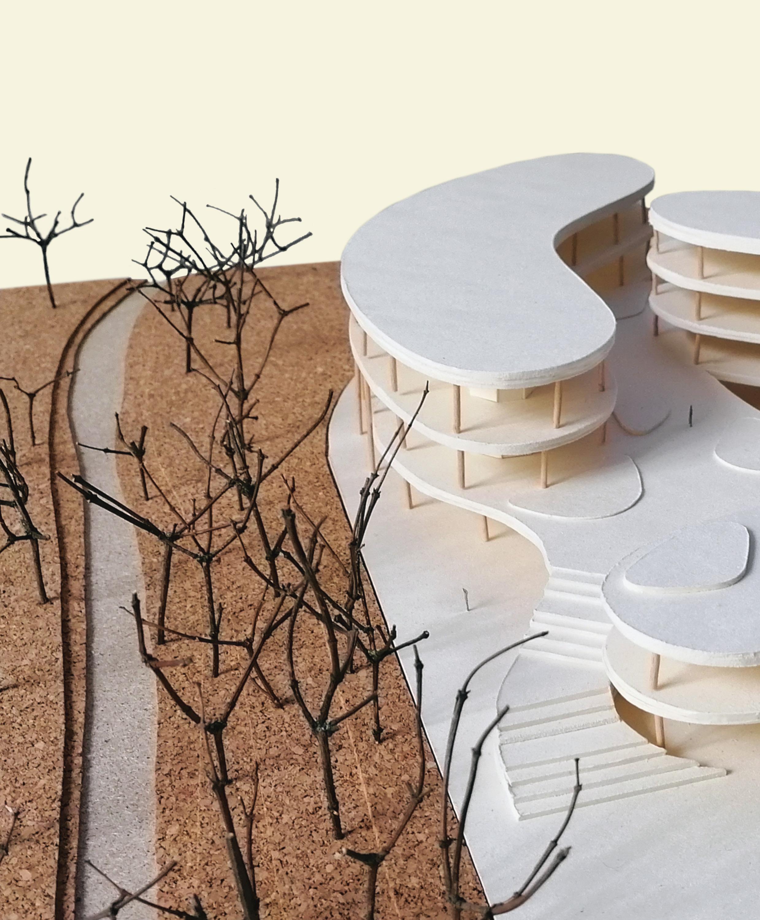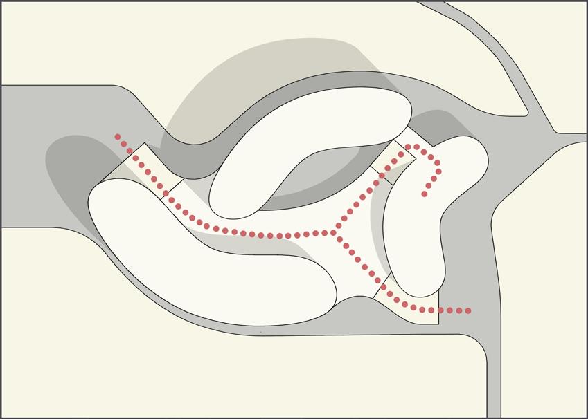Eine verbindende Erdgeschosszone vereint die drei Gebäudetrakte und bietet Platz für eine einfache Durchquerung sowie einer großzügigen Gemeinschaftszone.