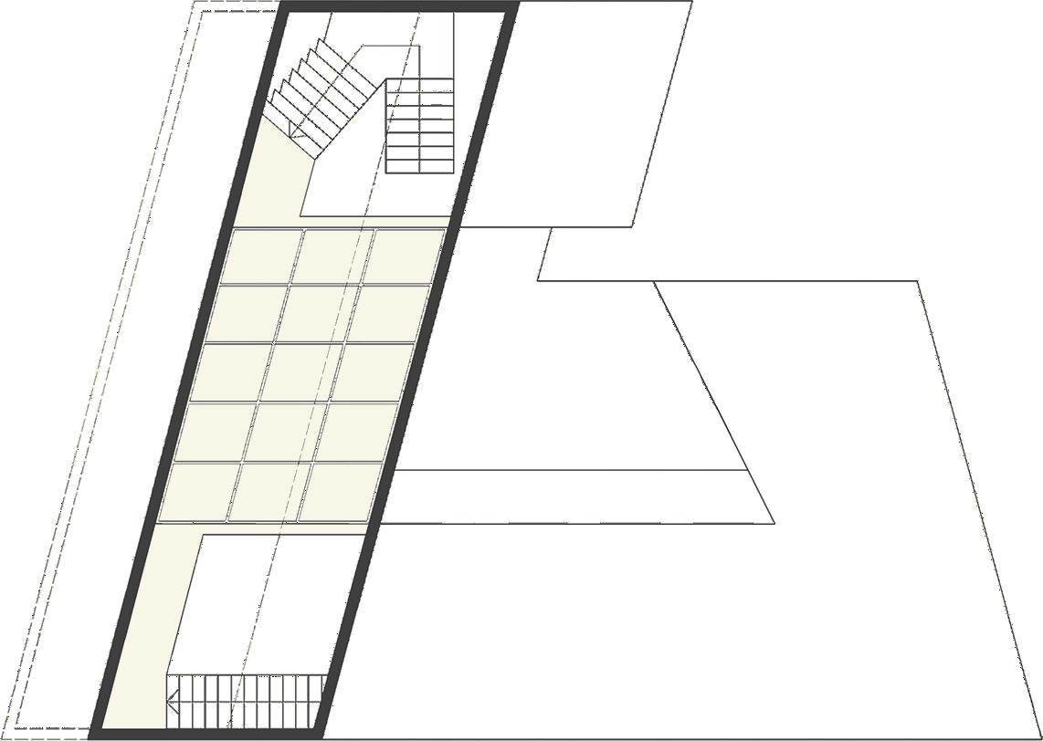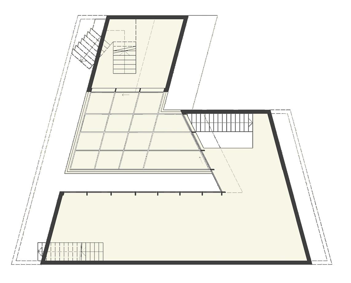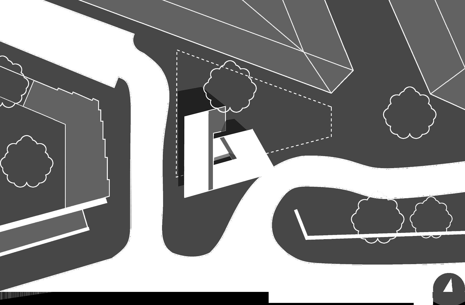 Gleichzeitig ergibt sich eine öffentliche Dachterrasse, die weitere Eingänge in das Gebäue erlaubt und durch ihre Begrünung den Bezug zum Umfeld verstärkt. Eine Durchwegung ist somit im Innen- wie im Außenbereich möglich.