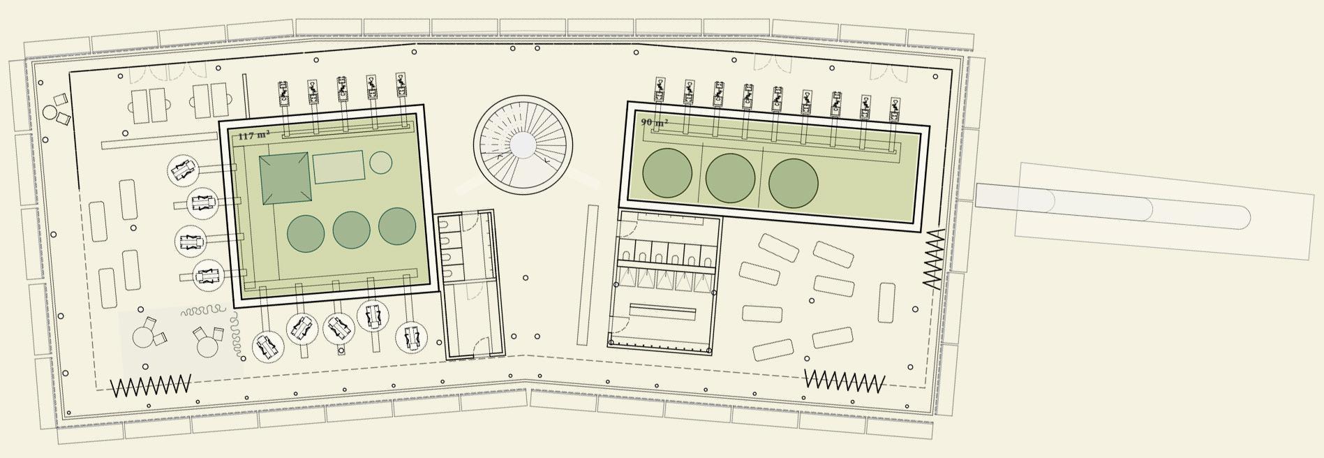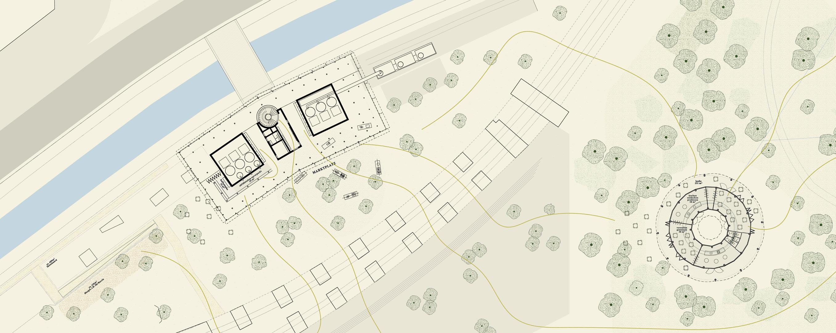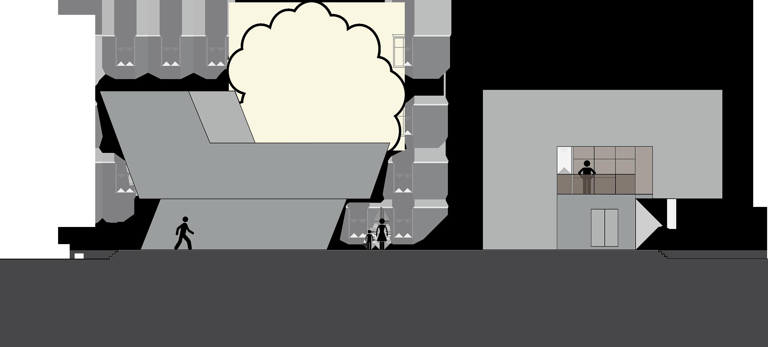 Die Kreuzung dieser beiden Achsen bietet Potential für einen besonders aufgewerteten öffentlichen Raum, dies wird durch mehrere Interventionen umgesetzt.