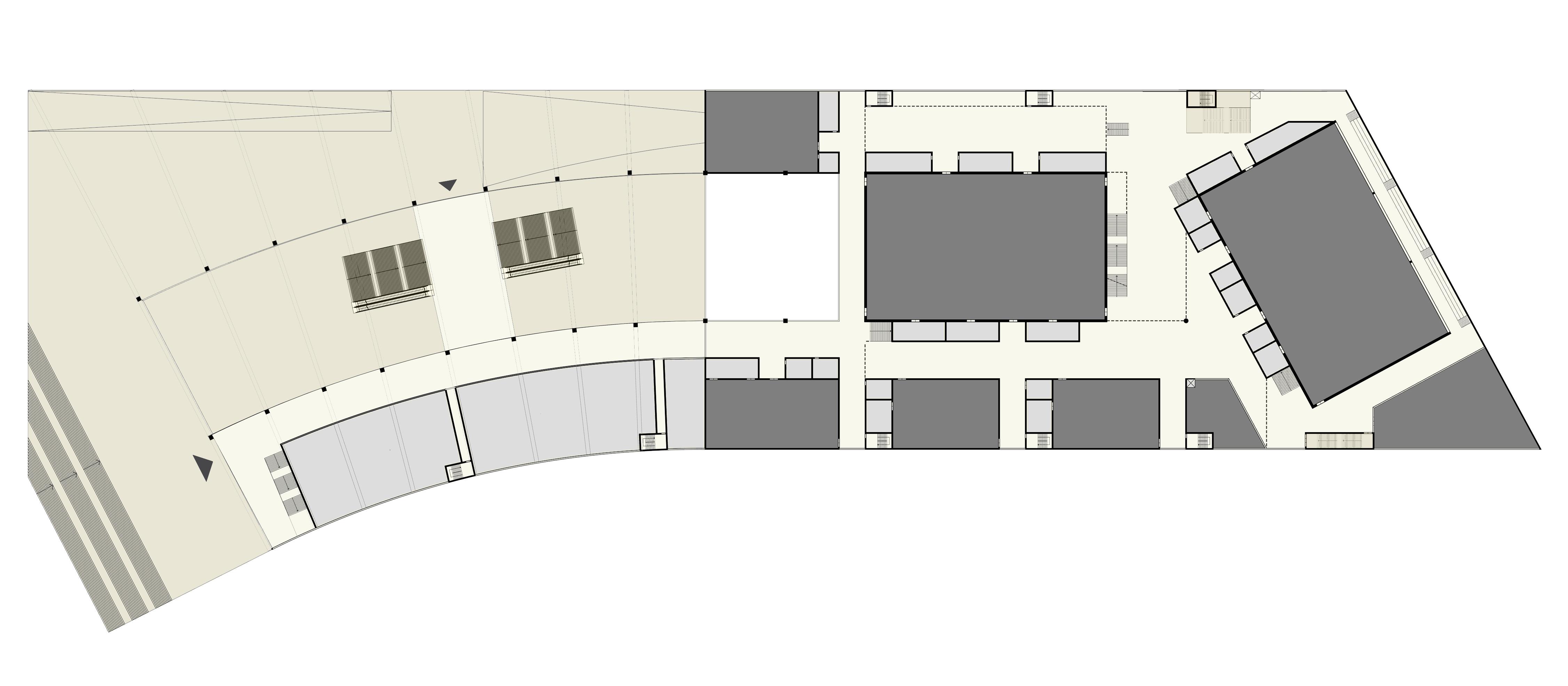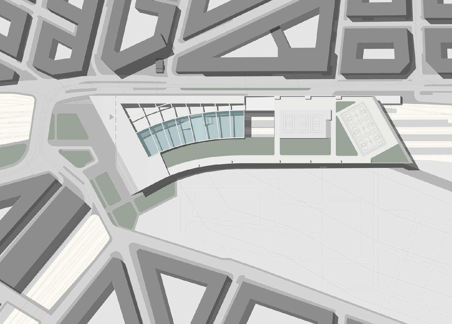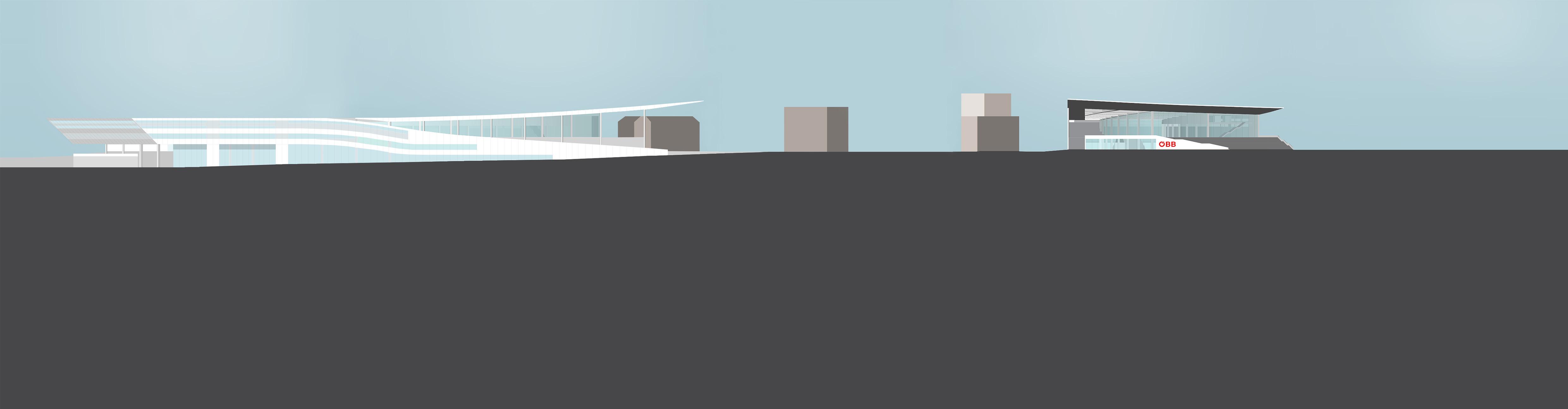 Die langgestreckte Gebäudeform nimmt den Schwung des Umfelds bzw. der Gleise auf und bildet somit einen Körper, der sich von Osten nach Westen in zwei Richtungen auseinander zieht.