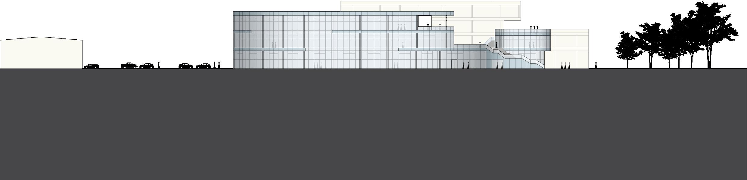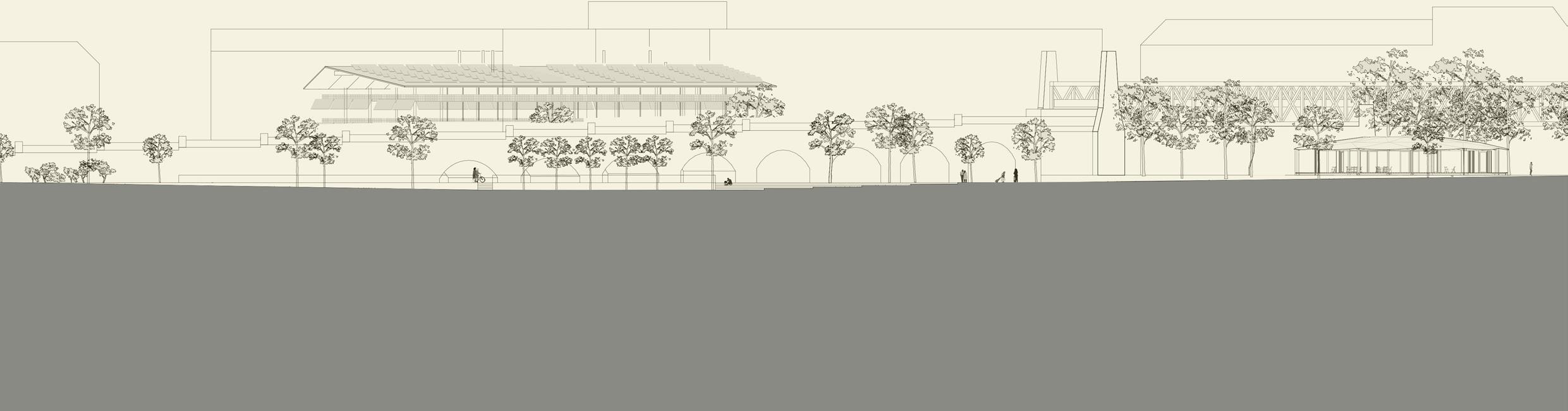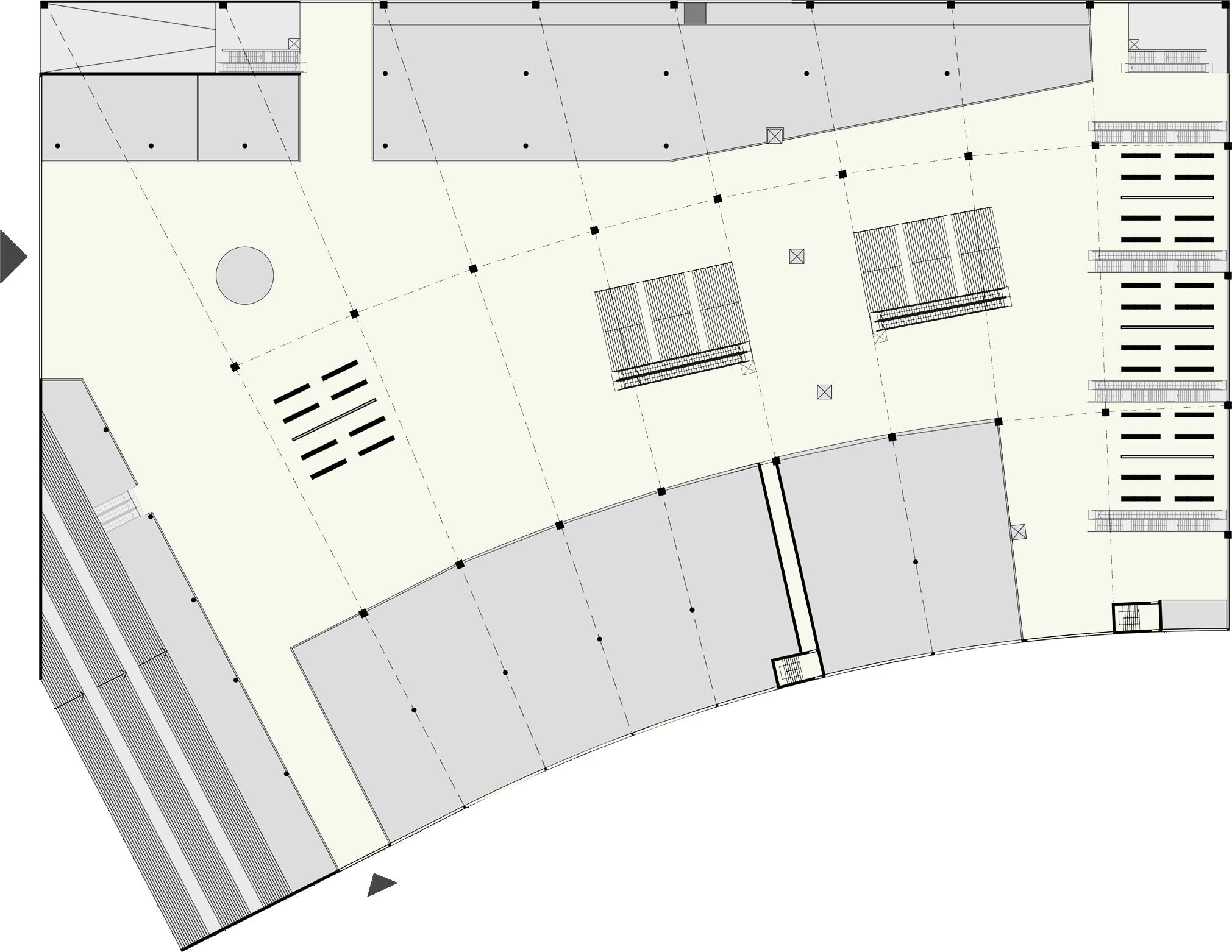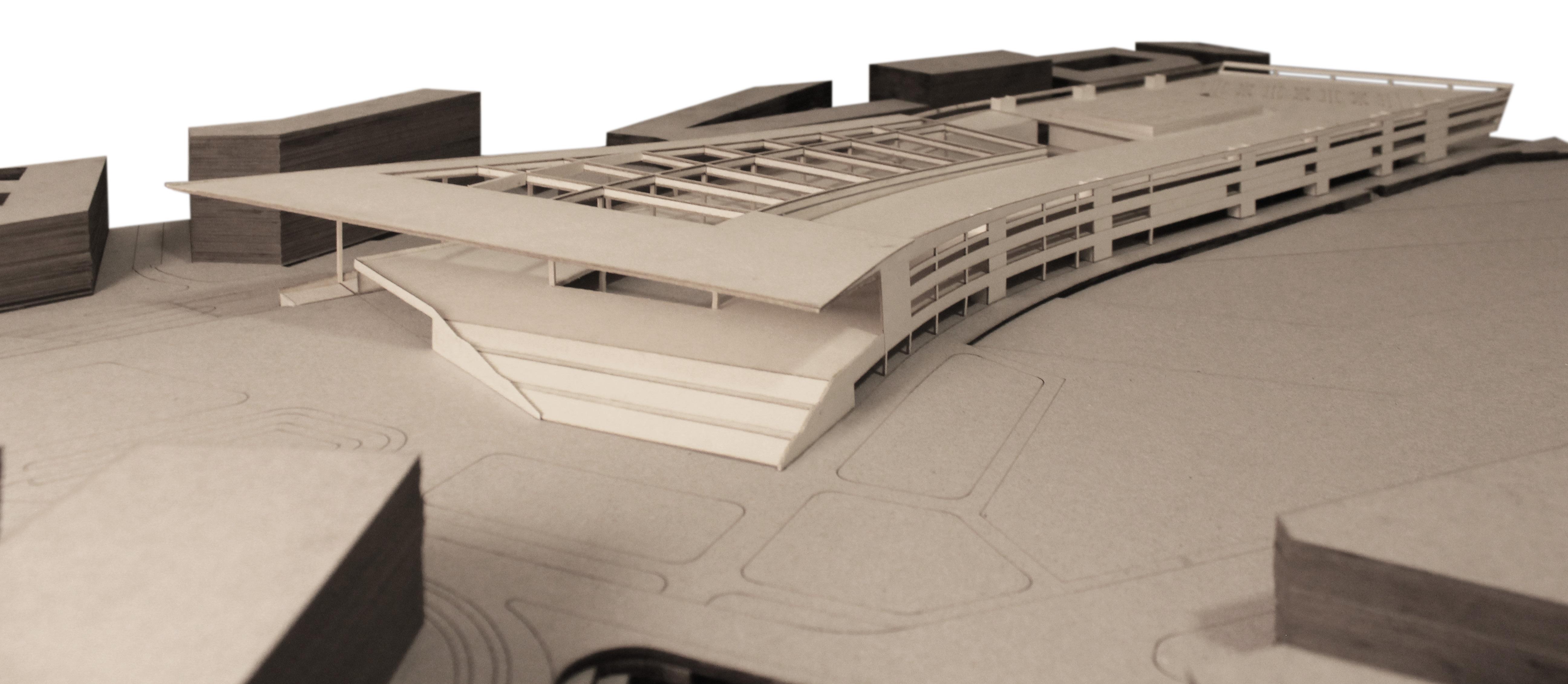 Die langgestreckte Gebäudeform nimmt den Schwung des Umfelds bzw. der Gleise auf und bildet somit einen Körper, der sich von Osten nach Westen in zwei Richtungen auseinander zieht.