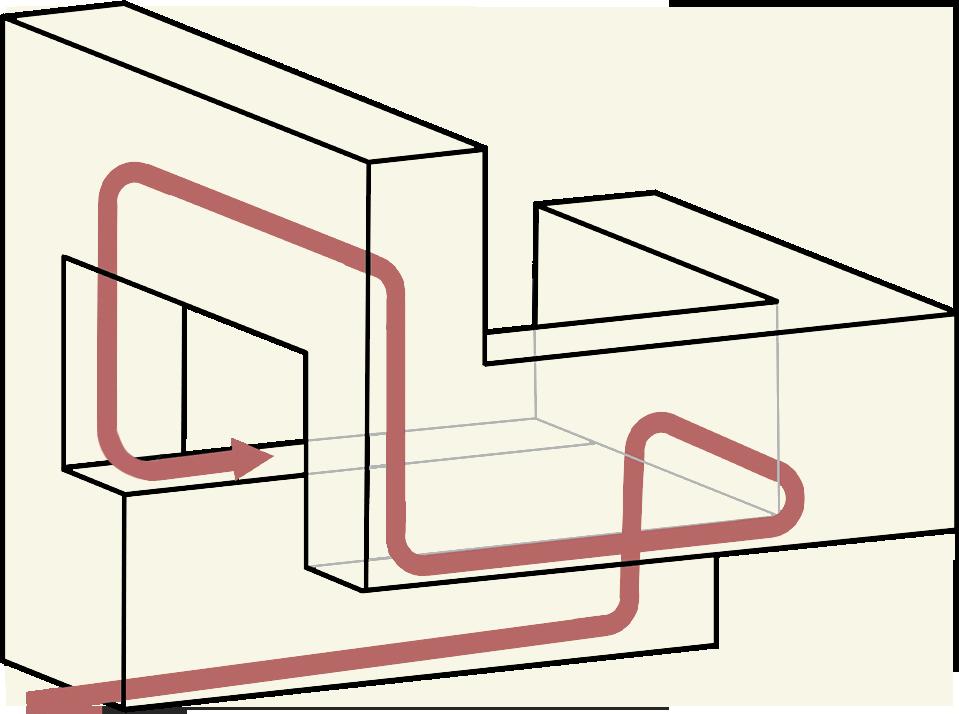 Auch die verglasten Wände legen sich im selben Muster über die Innenflächen des Pavillons. Die klare Außenform des Gebäudes wird dadurch nicht geschwächt. Das Dach des EGs und der Boden des 2.OGs sind hierbei transluzent ausgeführt. Wer also nicht durch die Performance wandern will, kann diese aus sicherem Abstand vom Cafe aus betrachten.