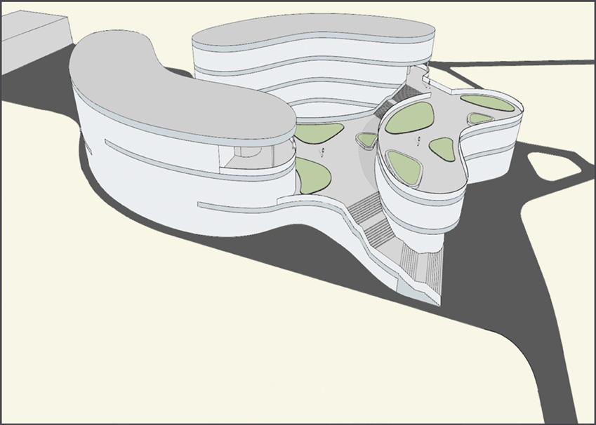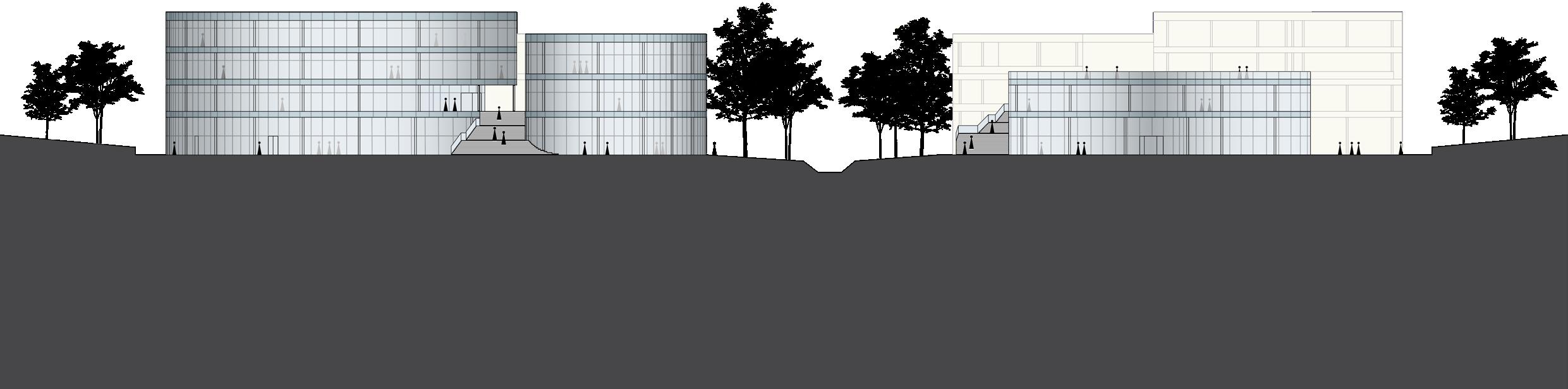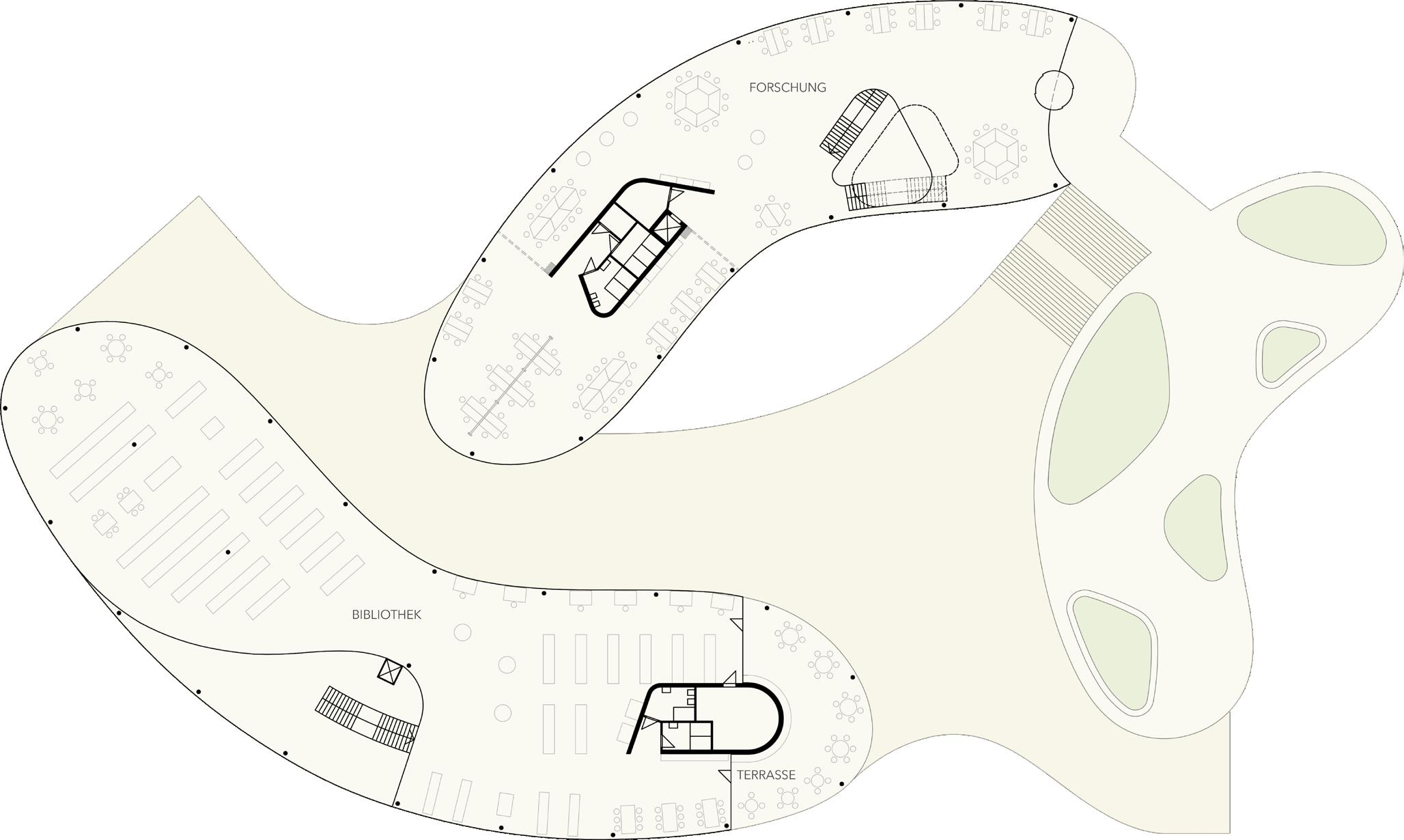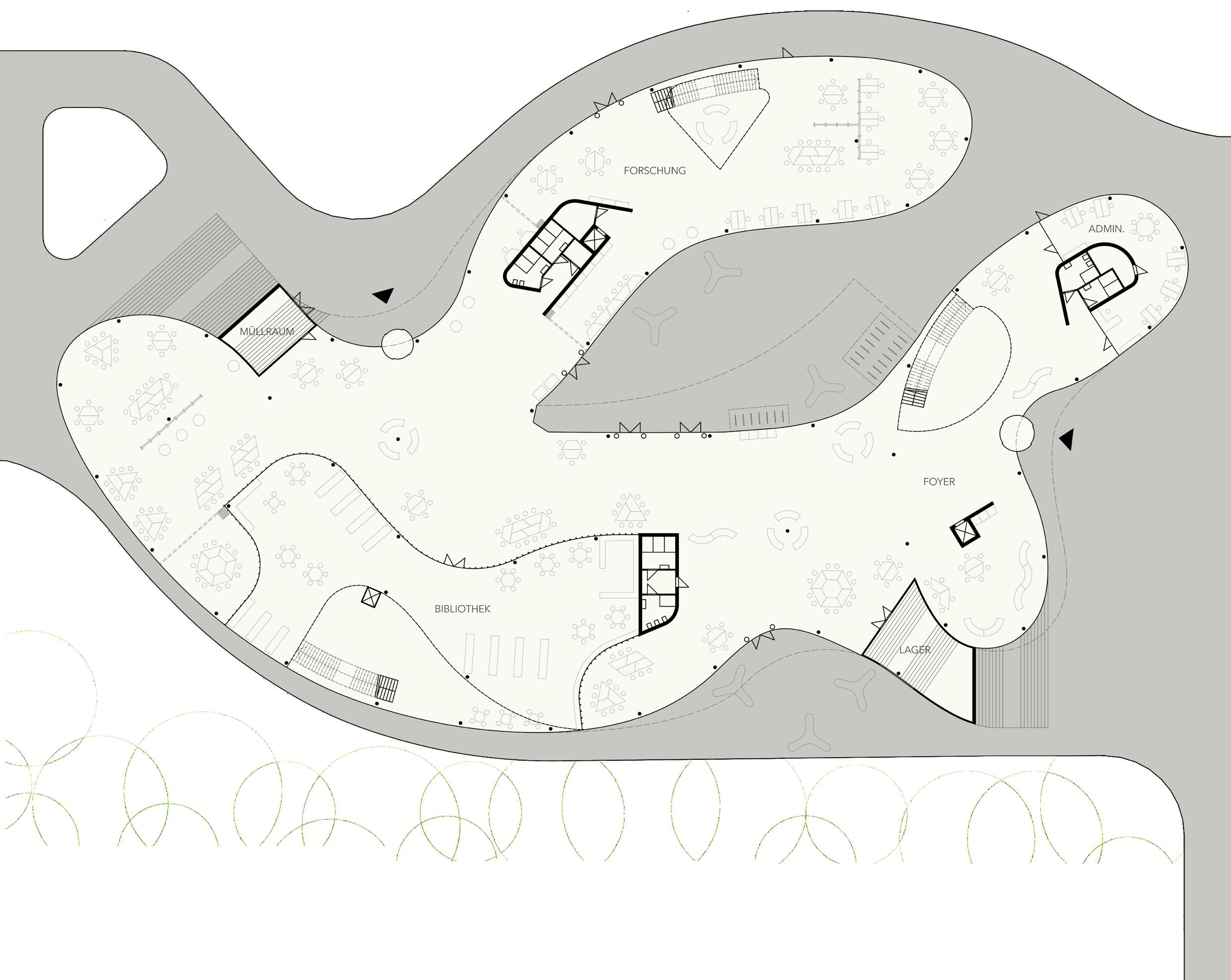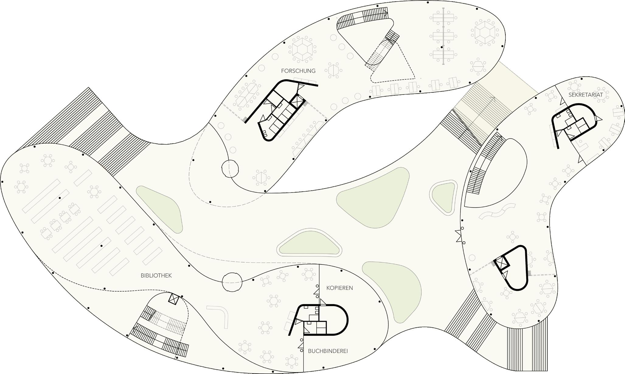 Der Östliche Trakt bietet Platz zum Lernen sowie Lehren in kleineren Gruppen. Auf große Hörsäle wird bewusst verzichtet. Im Süden, geschützt durch die angrenzende Baumreihe, befindet sich eine Bibliothek. Der dritte Trakt im Norden bietet Platz für die Forschung. Der Baukörper fällt höher und schmäler aus, um mehr Sonnenlicht in das Gebäude zu bringen.