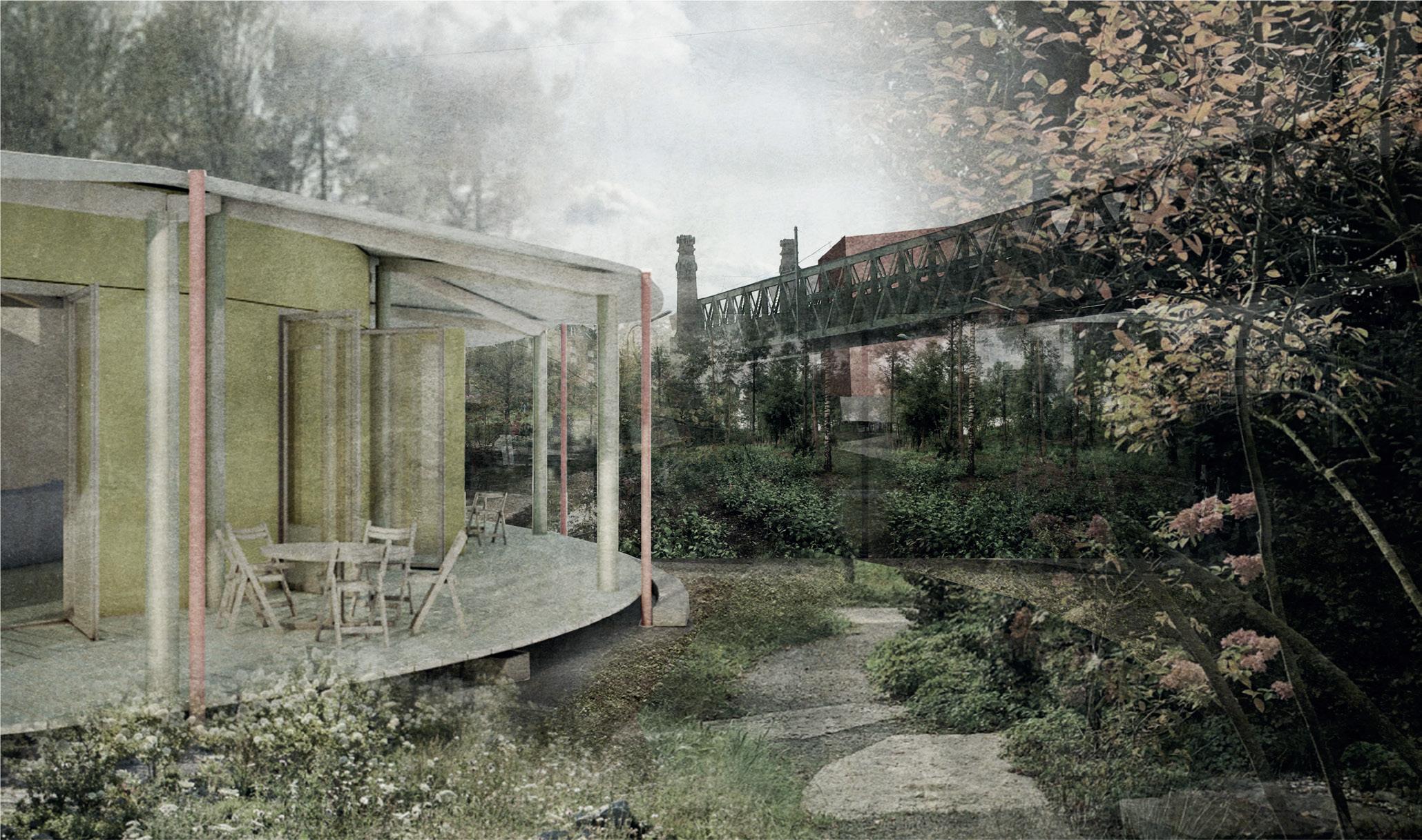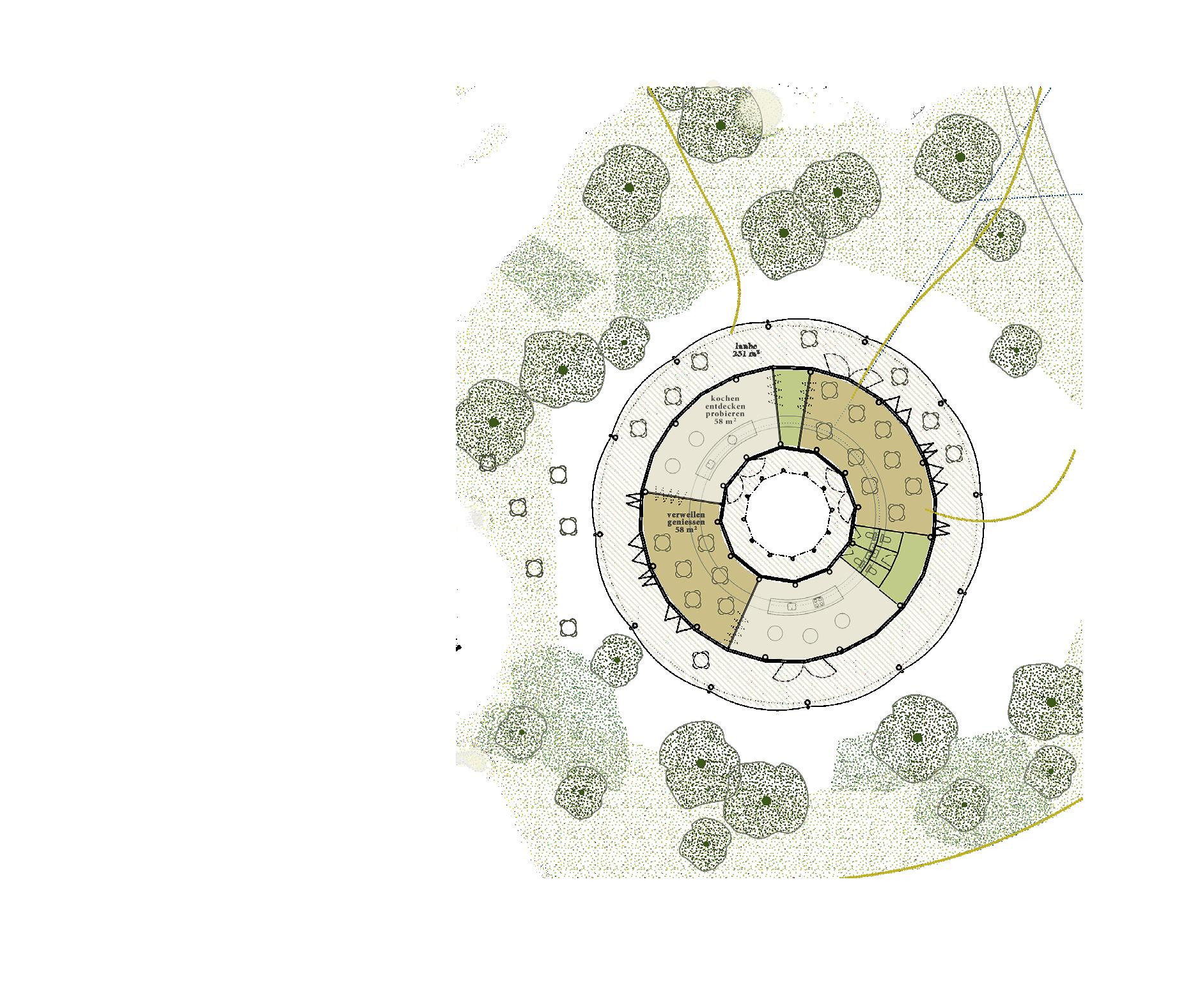Eine Gruppe von Pavillons entdeckt man erst innerhalb der aufgeforsteten Wildnis. Als runde Volumen, von jeder Seite zugänglich, orientieren sie sich an den Milchtrinkhallen zu Zeiten des Roten Wiens. Die Holzpavillons stehen auf einem Sockel, der Waldboden fließt darunter durch.