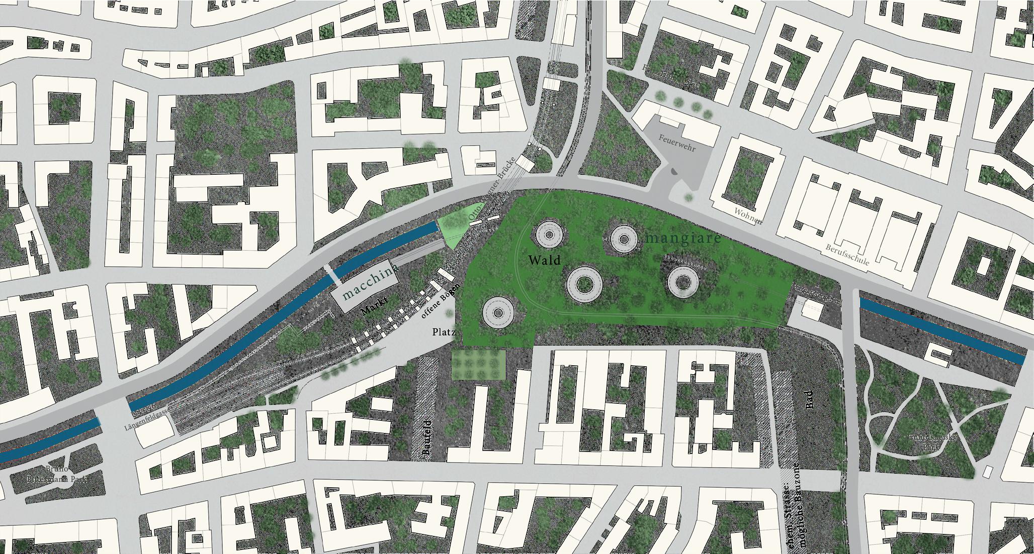 Der festgelegte Bereich wird nun mit übergeordneten Zonen, welche die öffentlichen Freiräume bilden, weiter formuliert.