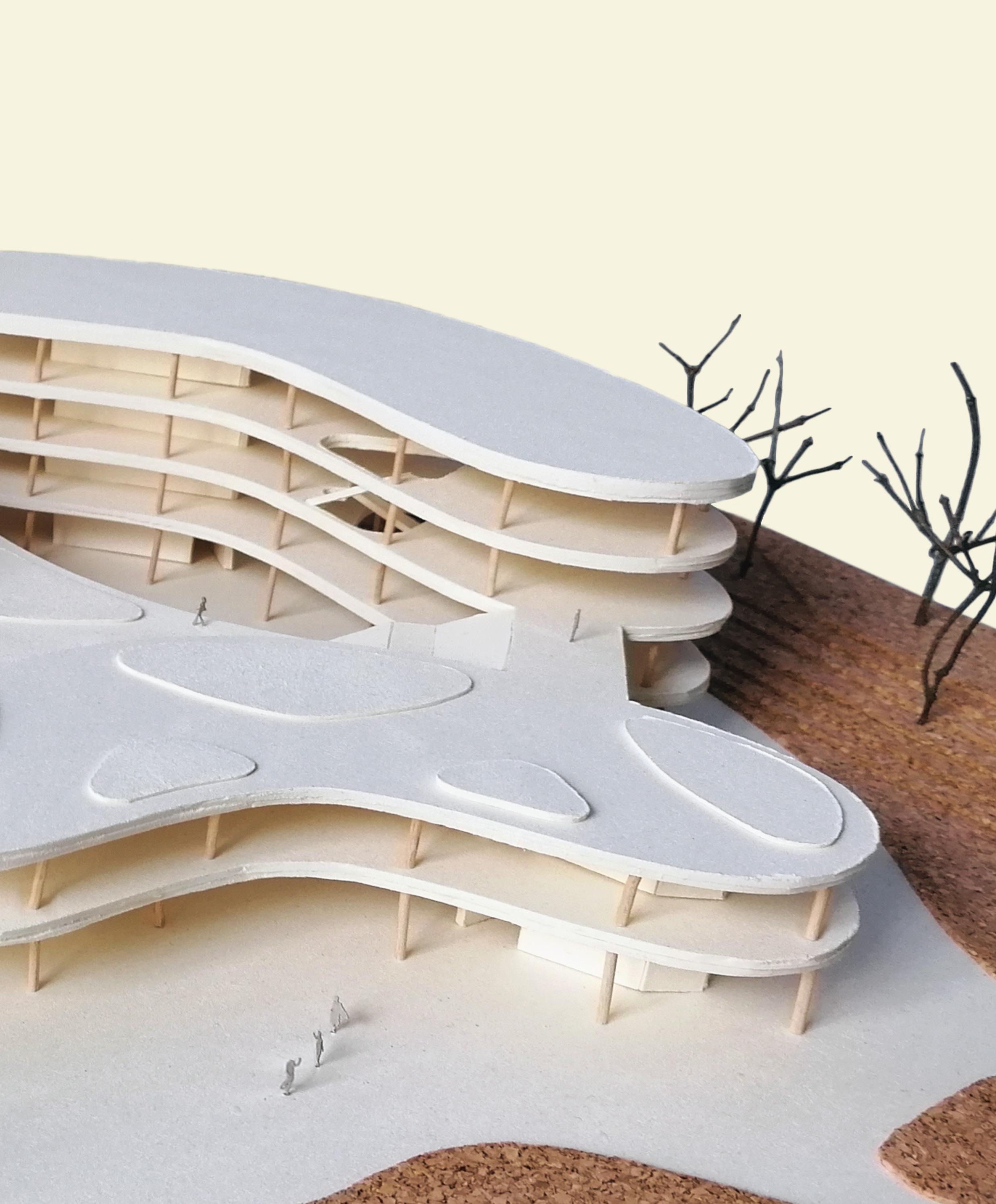 In diesem Lernzentrum kommen weiche Formen zum Einsatz, worduch sich der Baukörper besser in die Landschaft einbettet. Gleichzeitig wird im Innenraum genügend Flexibilität angeboten, um das Gebäude auf jede Nutzungsänderung anpassen zu können.