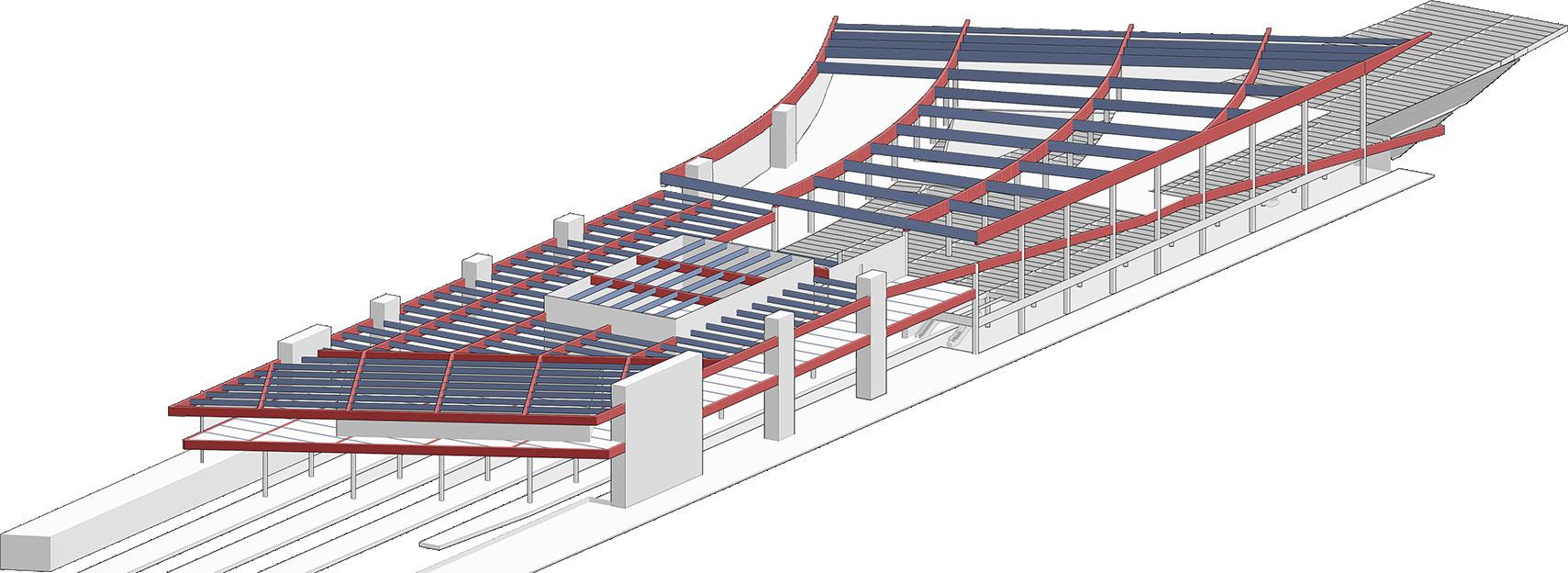 Über der weitgehend verglasten Bahnhofszone thront ein Dach, das sich Richtung Haupteingang weiter in die Höhe zieht und als weit auskragende Überdachung einen einladenden Vorplatz schafft.