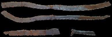 The leather saddle cover with wings is a part of the saddle whose main purpose was to provide more comfort for the rider and protect the horse’s sides while riding. This archaeological artefact consists of two main, almost symmetrical, irregular shaped details, connected by sewing together their long edges. These elements of the work were cut from soft, vegetable-tanned goat hide, while the edges were sewn around with a strip of calf hide. The existing thread marks on the inside of the edging strip suggest that a soft backing (e.g., felt) of some kind was sewn onto the bottom of the leather cover, which has unfortunately not survived. A natural plant fibre was used to sew the details together, which could not be more accurately identified due to the high degree of disintegration. Rivet marks remain on the edges of the work, which were probably used to attach the leather cover to a wooden saddle body. Part of a wooden saddle was also discovered with the leather saddle cover whilst conducting archaeological excavation work. However, after restoring both of these works, the initial hypothesis that they could have come from the same set of saddlery was not confirmed – the shape and size of the works did not match, nor did the rivet positions on the leather and wooden parts.