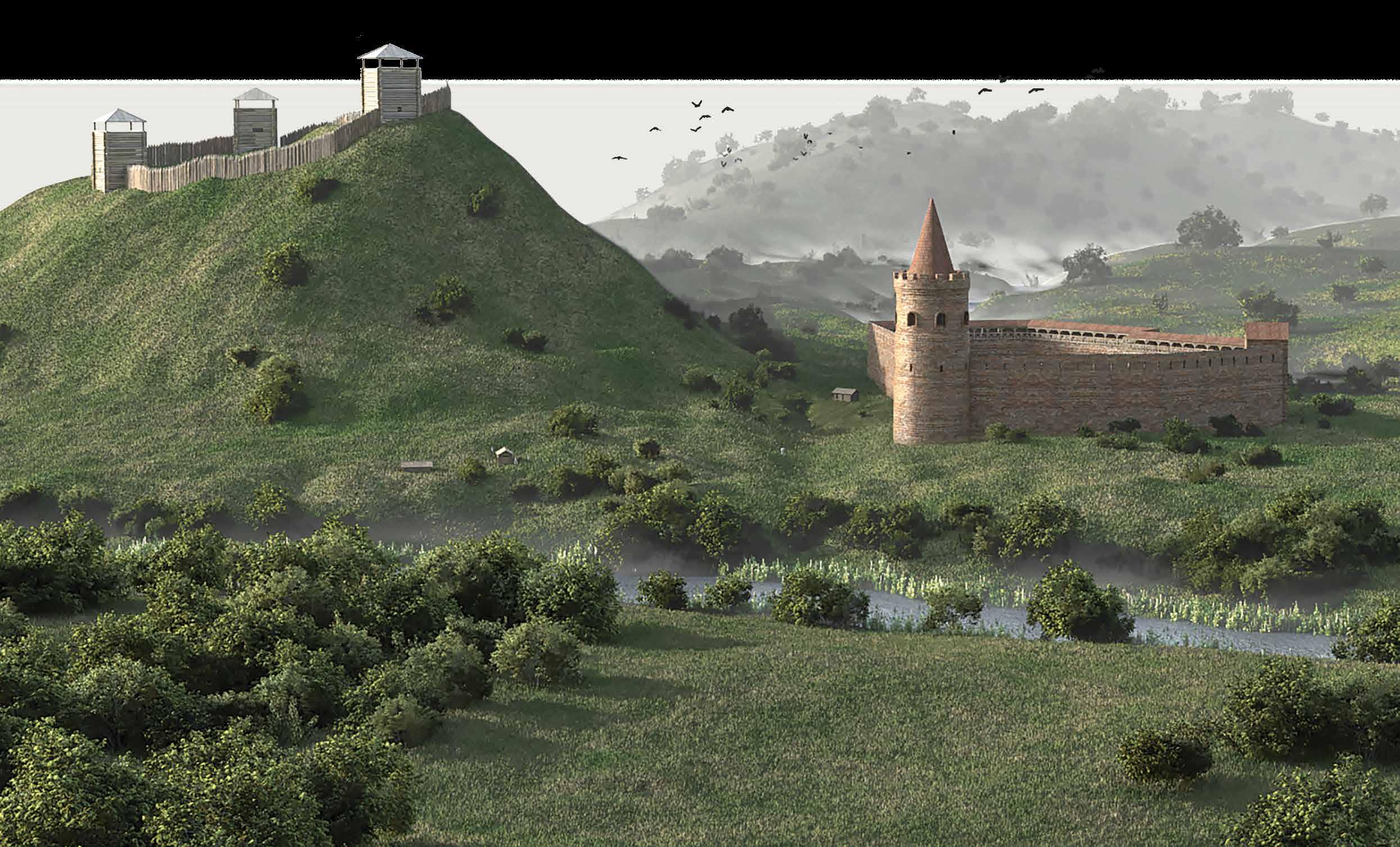Vizualizacijos Archeologinio svirno rekonstrukcija ir XIII a. pabaigos Vilniaus vizija fragmentas (autorius Rimas Sakalauskas)