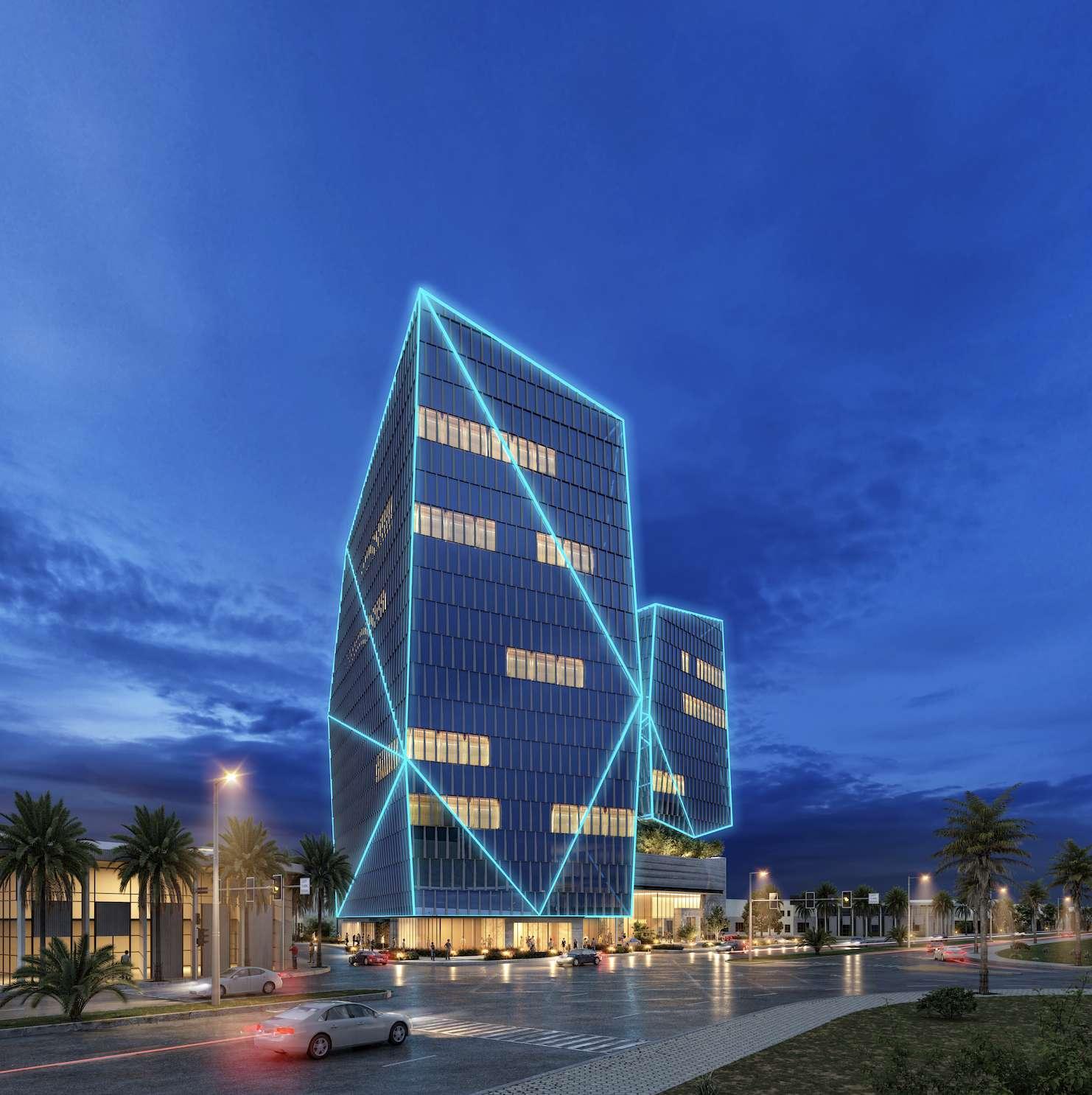 This cutting-edge office building features a distinctive two-story design with a figure-eight layout. The two wings, each with open courtyards, house office spaces, while the central connector contains the main entry lobby, vertical circulation, restrooms, and other areas requiring minimal natural light.